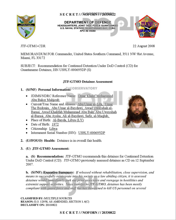 ليبيا- أظهرت وثائق أزالت الحكومة الأمريكية السرية عنها بعضاً من سيرة معتقل ليبي في معتقل غوانتنامو تدرس واشنطن إعادته إلى ليبيا بعد أن امضى أكثر من عقد من الزمن في المعتقل .