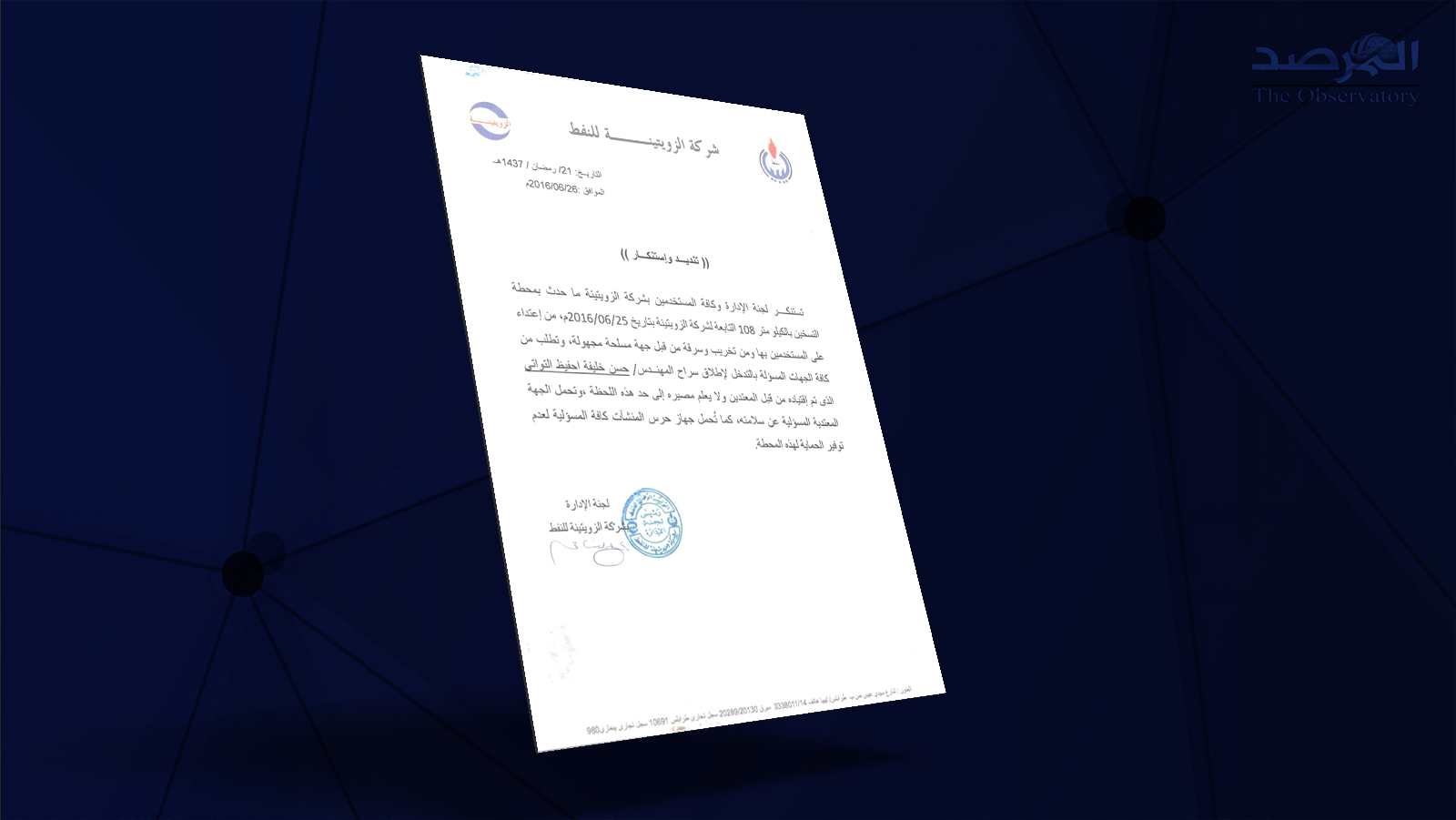 و طالبت الشركة في بيان لها تحصلت المرصد على نسخة عنه و الصادر بتاريخ 26 / 6 /2016 كافة الجهات المسؤولة بالتدخل لإطلاق سراح المهندس “حسن خليفة احفيظ التواتي” الذي تم اقتياده من قبل المقتحمين دون معرفة مصيره حتى تاريخ كتابة البيان.