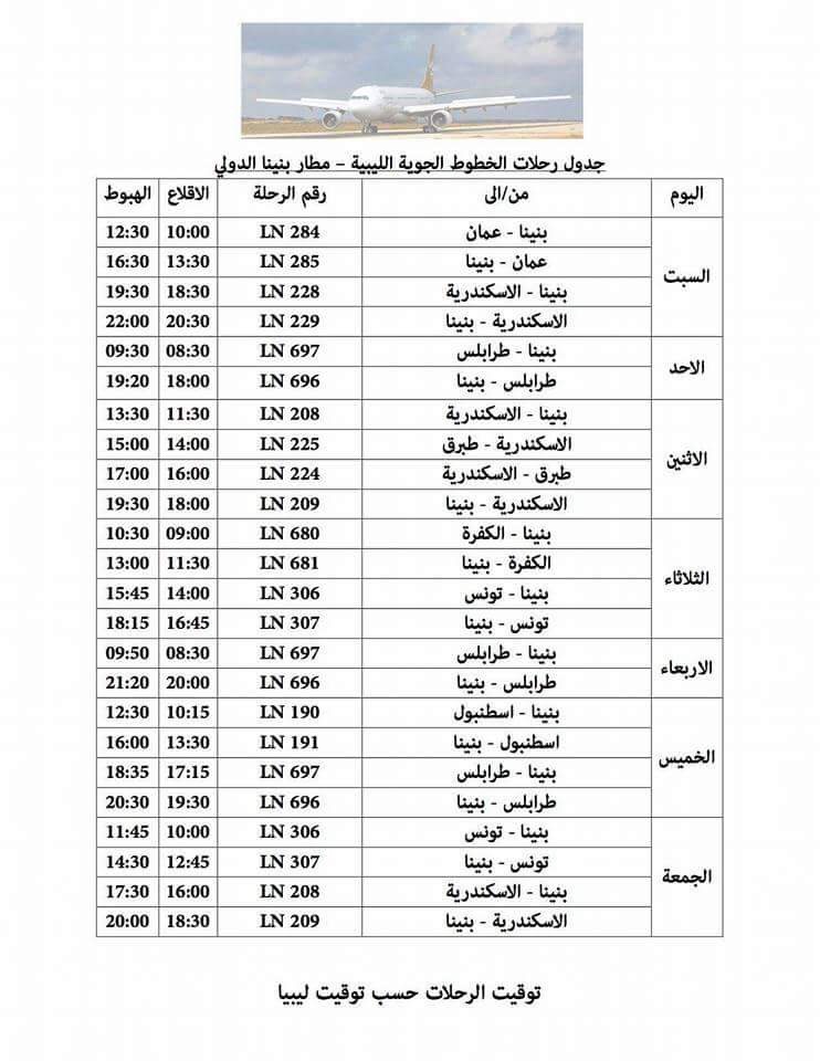 كما ستسير الليبية رحلة داخلية الى طرابلس يومي الاحد و الإربعاء و الخميس و أخرى من الكفرة الى بنينا يوم الثلاثاء على أن تكون رحلات تونس من بنينا أيضاً أيام الثلاثاء و الخميس أما إسطنبول ستكون رحلة أسبوعية واحدة يوم الإربعاء .