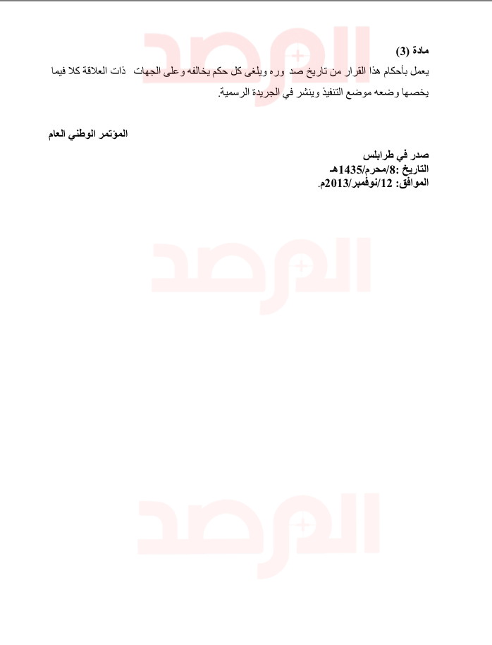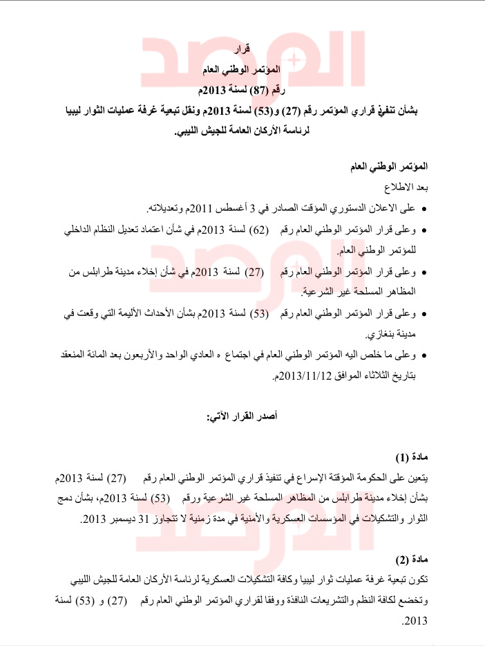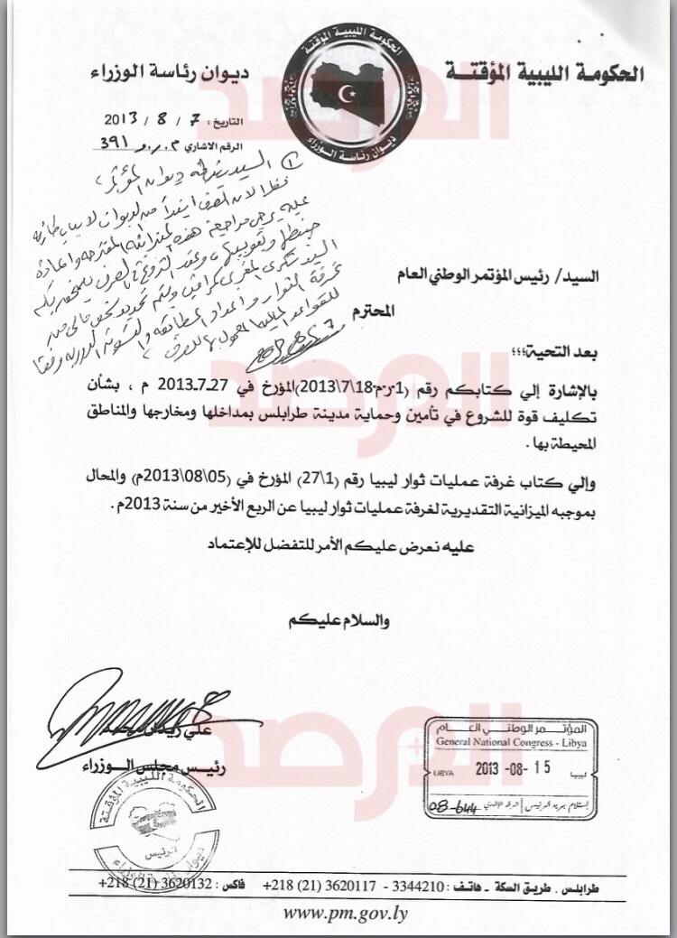 و تستند الوثائق على قرار أصدره رئيس المؤتمر الوطني العام نوري أبوسهمين فى 27 يوليو 2013 بشأن ” تكليف قوة لحماية طرابلس ” و هو القرار الذي أحدث إنقسامات حادة داخل المؤتمر لصدوره من بوسهمين بصفة القائد الاعلى للجيش الليبي رغم إنتهاء صلاحية تفويضه بتلك الصفة .