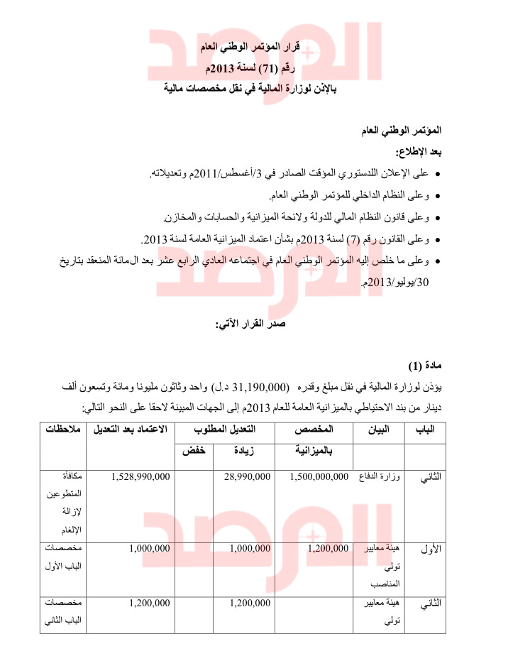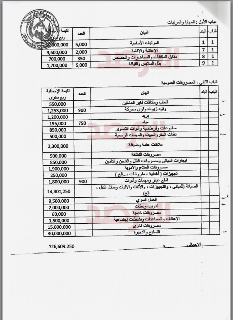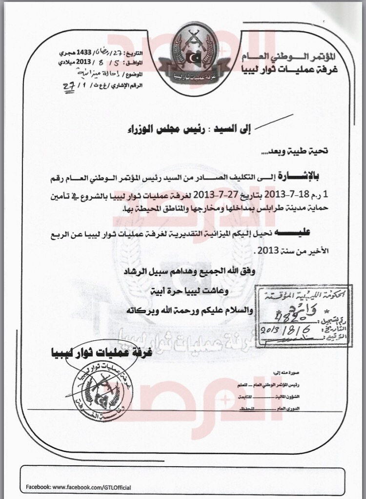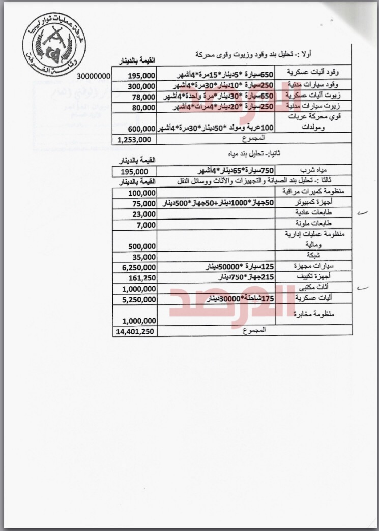 ليبيا – تحصلت صحيفة المرصد الليبية على وثائق أرشيفية تتعلق بالميزانية الأكثر جدلاً خلال السنوات الست الأخيرة و التي خصصت من رئيس المؤتمر العام لغرفة عمليات ثوار ليبيا بناءً على طلبها بعد إصداره قرار تشكيلها .