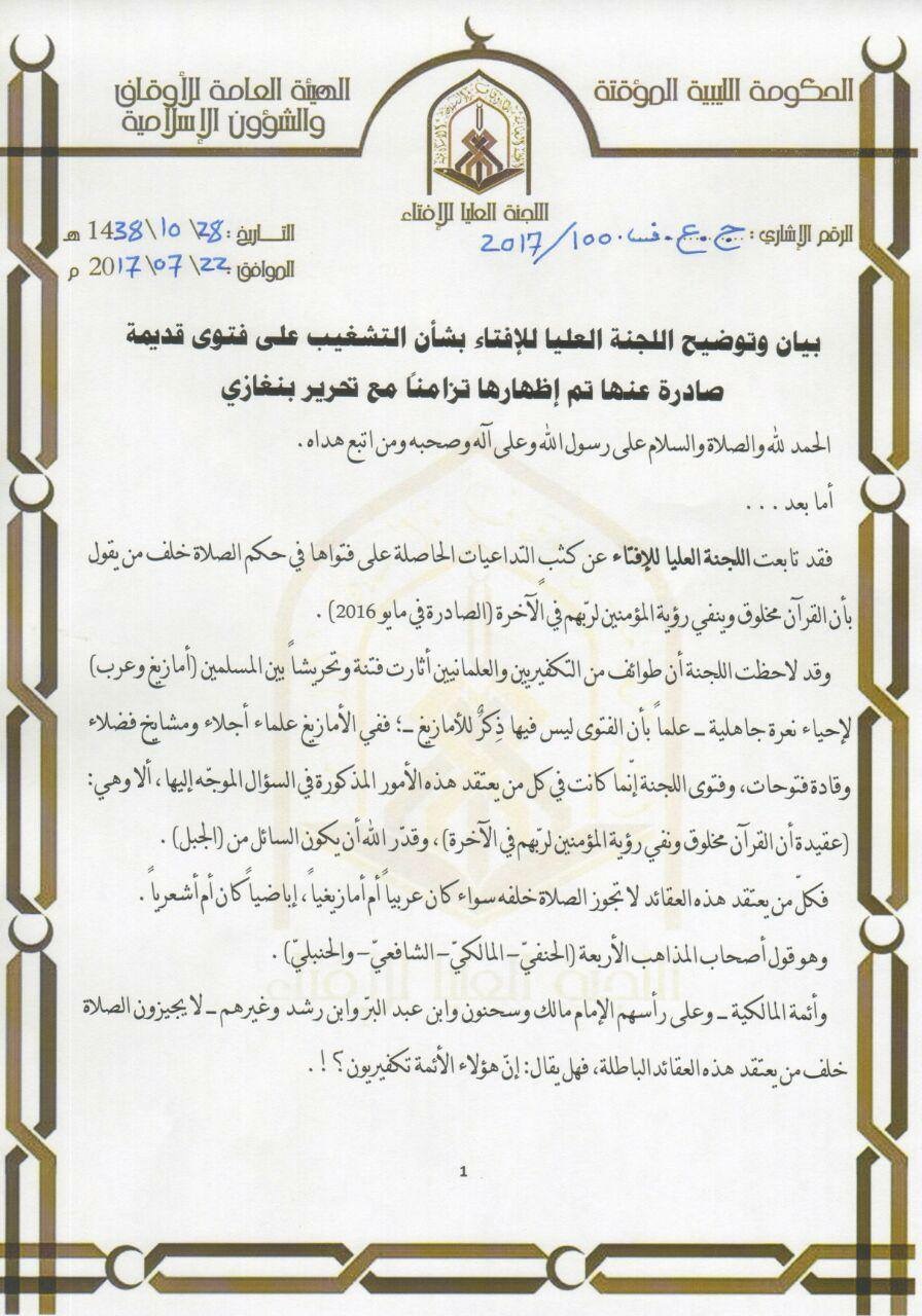 و أضافت إفتاء المؤقتة بأن كل من يعتقد هذه العقائد لا تجوز الصلاة خلفه سواء كان عربياً أم أمازيغياً، إباضياً كان أم أشعرياً و ذلك وفقاً لقول أصحاب المذاهب الأربعة (الحنفيّ- المالكيّ- الشافعيّ- والحنبليّ) يضاف لعم وأئمة المالكية و على رأسهم الإمام مالك وسحنون وابن عبد البرّ وابن رشد وغيرهم من الذين قالت إنهم لا يجيزون الصلاة خلف من يعتقد هذه العقائد التي أكدت بطلانها .