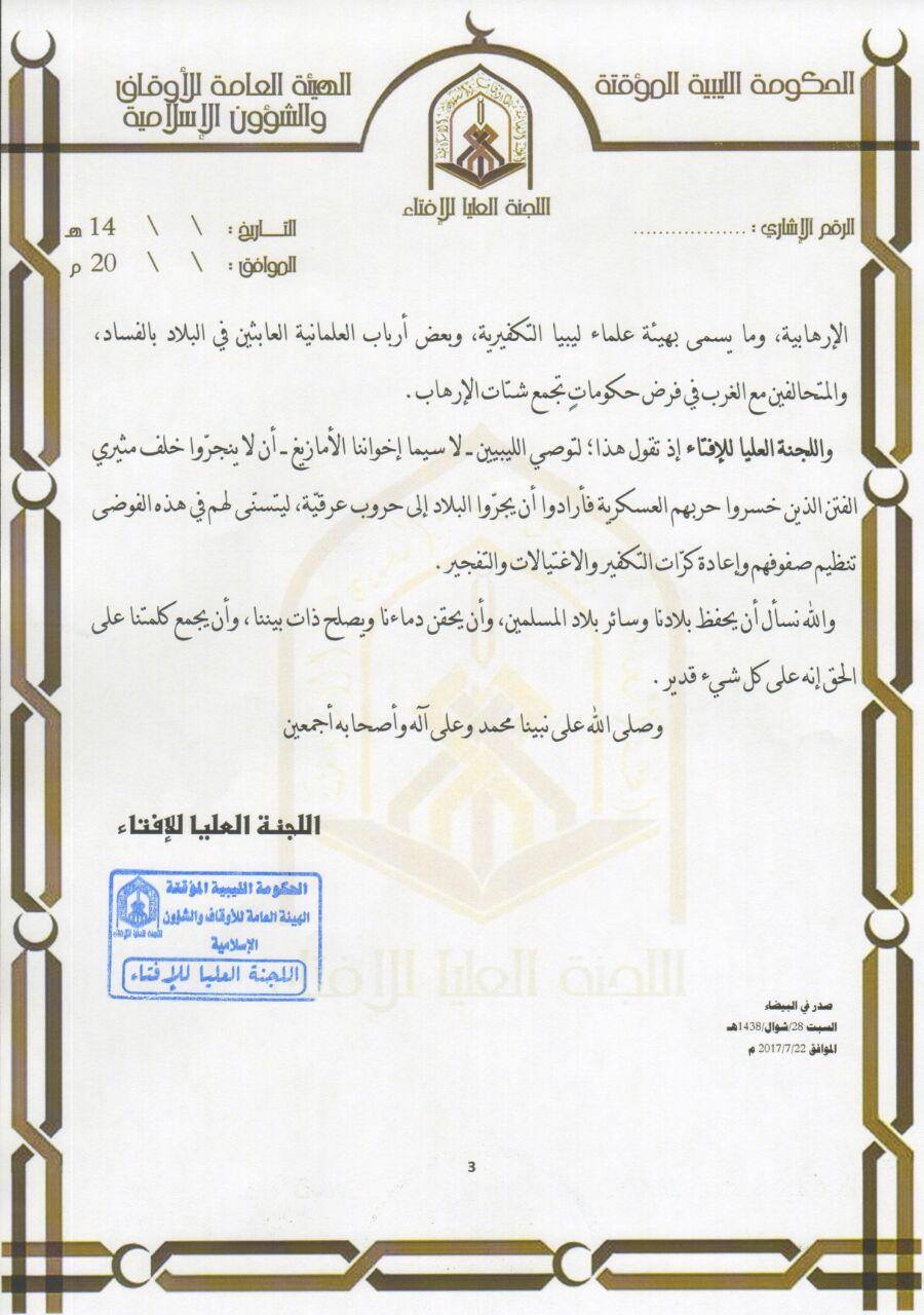 و ختمت اللجنة العليا للإفتاء بيانها موجهة رسالة الليبيين عامة و الأمازيغ خاصة بعدم الانجرار خلف من وصفتهم بمثيري الفتن الذين خسروا حربهم العسكرية فأرادوا أن يجرّوا البلاد إلى حروب عرقيّة، ليتسنّى لهم في هذه الفوضى تنظيم صفوفهم وإعادة كرّات التكفير والاغتيالات والتفجير ، و ذلك على حد تعبيرها .