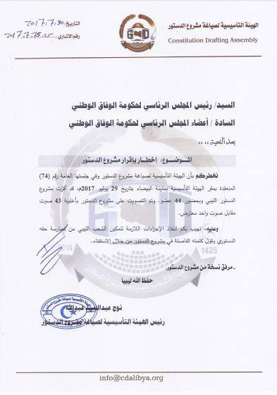 مطالبة عبد الله أتت عبر مخاطبة صدرت أمس الأحد وحصلت صحيفة المرصد على نسخة منها ووصلت اليوم الإثنين إلى مجالس الرئاسي والدولة أشار فيها إلى إقرار مشروع الدستور بالأغلبية شبه المطلقة داخل الهيئة .