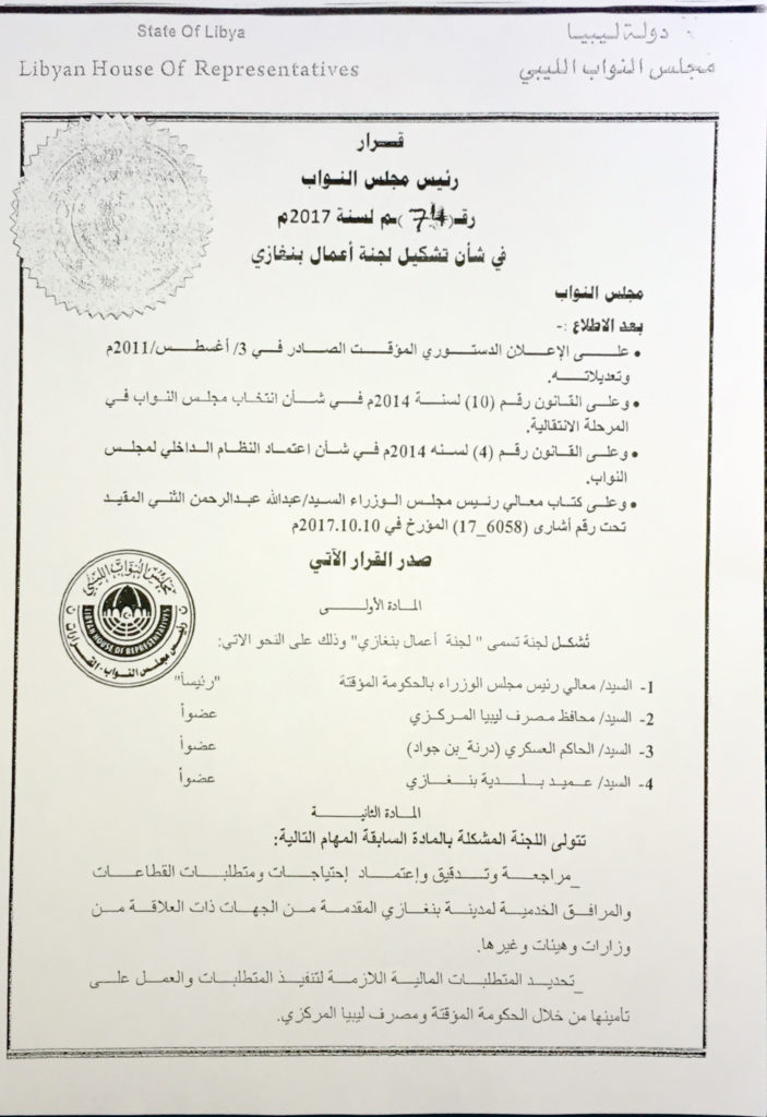 ليبيا – قرر رئيس مجلس النواب المستشار عقيلة صالح تشكيل لجنة تسمى”لجنة أعمال بنغازي” والتي يكون رئيسها رئيس الحكومة المؤقتة وأعضائها كلاً من محافظ مصرف ليبيا المركزي والحاكم العسكري “درنة_ بن جواد” وعميد بلدية بنغازي.