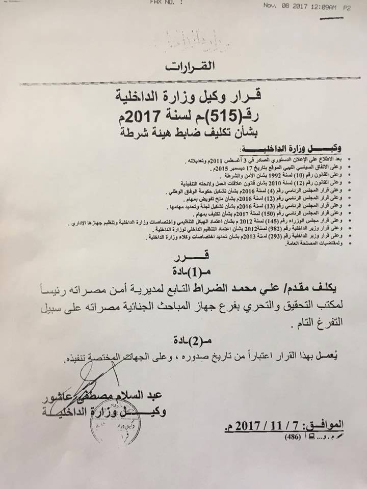 ليبيا – أصدر وكيل وزارة الداخلية بحكومة الوفاق عبد السلام مصطفى عاشور قرار يقضي بتكليف المقدم علي محمد الضراط التابع لمديرية أمن مصراتة رئيساً لمكتب التحقيق و التحري بفرع جهاز المباحث الجنائية مصراتة على سبيل التفرغ التام.