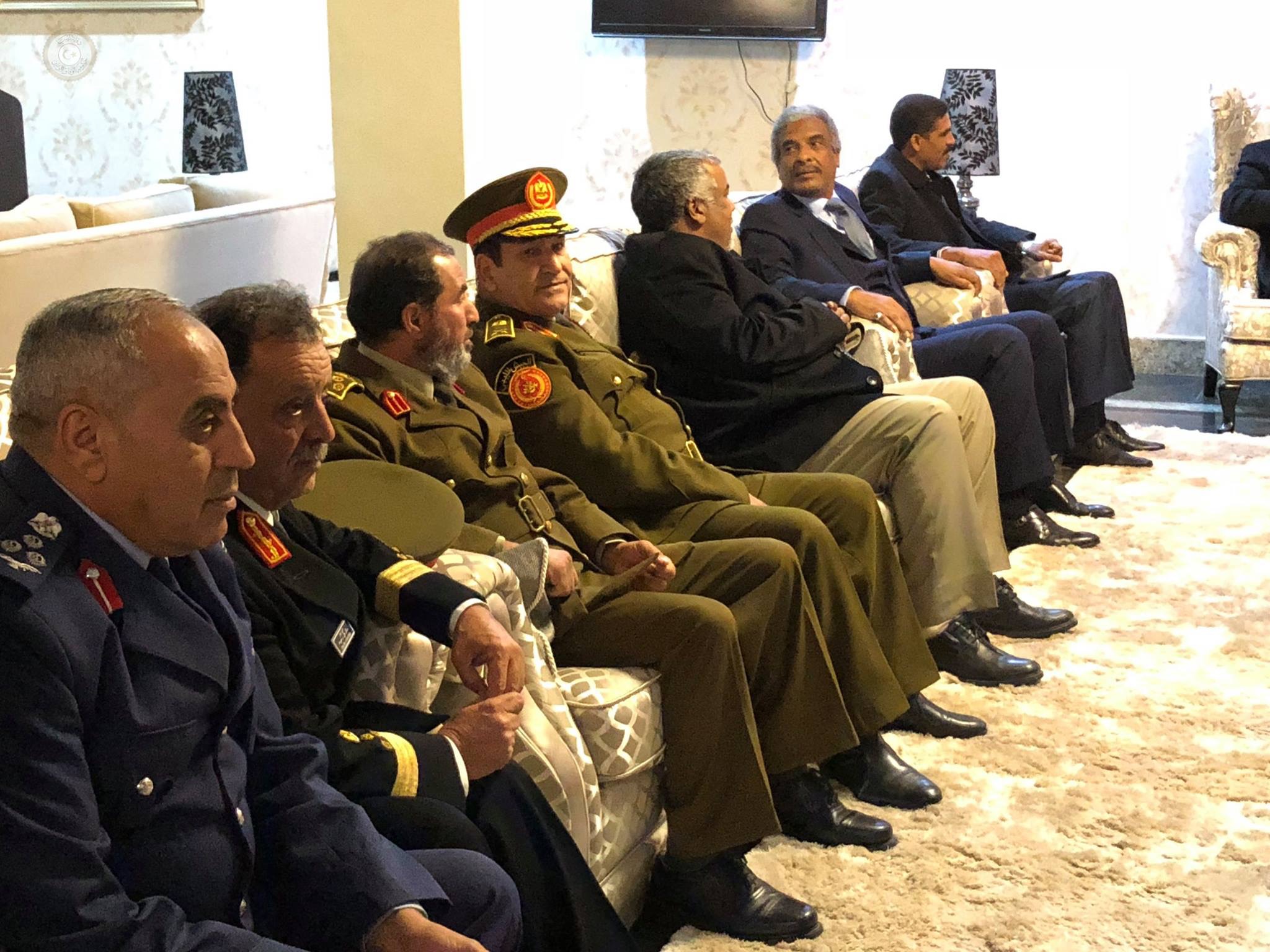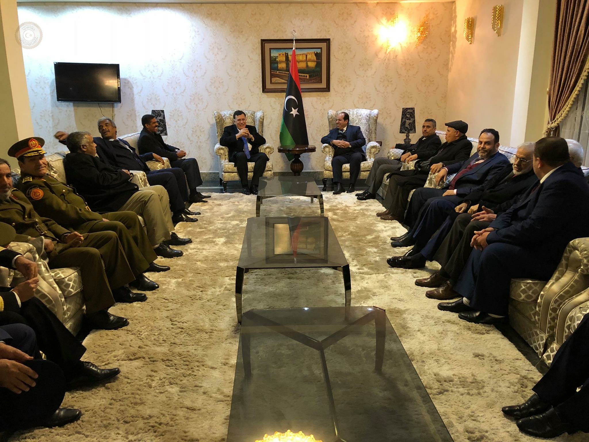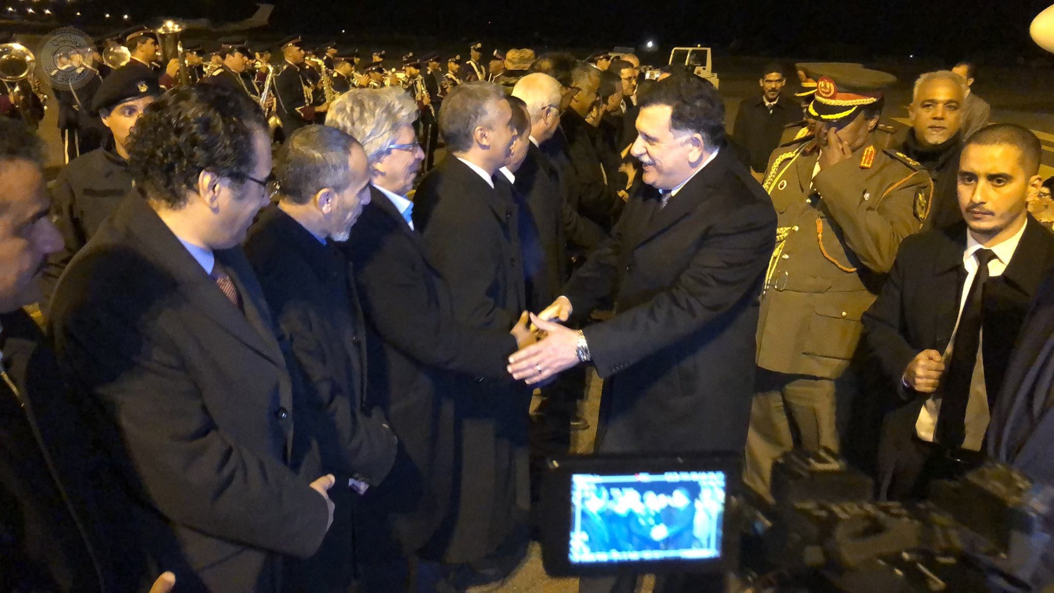 وكان في استقباله في مطار معيتيقة الدولي بحسب إيجاز صحفي عن مكتبه الاعلامي عضوي الرئاسي أحمد معيتيق وأحمد حمزة وعدد من الوزراء ووكلاء الوزارات وأعضاء مجلس النواب و ” حشد من الشخصيات والفعاليات السياسية والاجتماعية وقيادات عسكرية وأمنية حيث عزف النشيد الوطني واستعرض فيهم السراج حرس الشرف وذلك بحسب نص الايجاز ” .