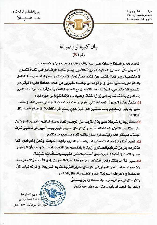 واختتمت الكتيبة بيانها بالتأكيد على أن رجوعها لمدينة صبراتة مر لا مفر منه ولا محيد عنه وأن العيش في الوطن أحرار أمر جاءت به الشريعة وأقرته كل الانظمة والاعراف الدولية والاقليمية .
