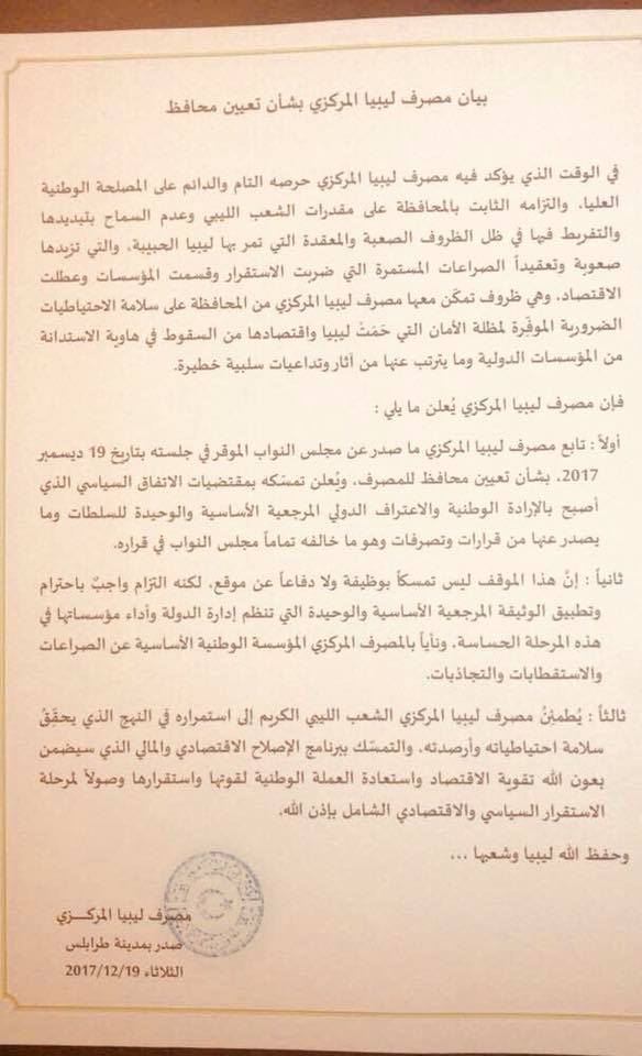 وأعلن الكبير في بيانه عن 3 أمور مهمة أولها متابعته ما صدر عن مجلس النواب في جلسته اليوم بشأن تعيين محافظ للمصرف وتمسكه بمقتضيات الإتفاق السياسي الذي أصبح بالإرادة الوطنية والإعتراف الدولي المرجعية الأساسية والوحيدة للسلطات وما يصدر عنها من قرارات وهو ما خالفه المجلس في قراره .