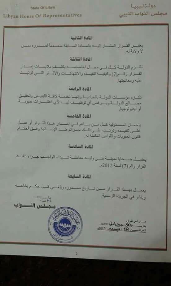 ليبيا – أصدر مجلس النواب قرار رقم “15” لسنة 2017 بشأن القرار رقم “7” الصادر عن المؤتمر الوطني العام لسنة 2012 بشأن اقتحام مدينة بن وليد بقوة السلاح .
