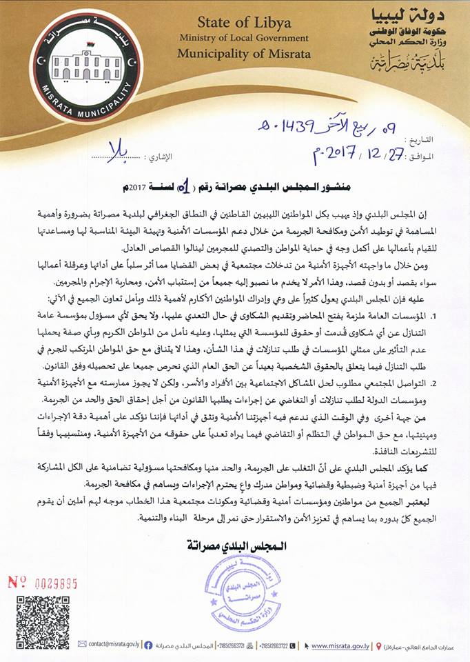 ليبيا – أهاب المجلس البلدي مصراتة كل المواطنين القانطين في النطاق الجغرافي للبلدية بضرورة وأهمية المساهمة في توطيد الامن ومكافحة الجريمة من خلال دعم المؤسسات الامنية وتهيئة البيئة المناسبة لها ومساعدتها للقيام بأعمالها على أكمل وجه في حماية المواطن والتصدي للمجرمين لينالوا القصاص العادل.