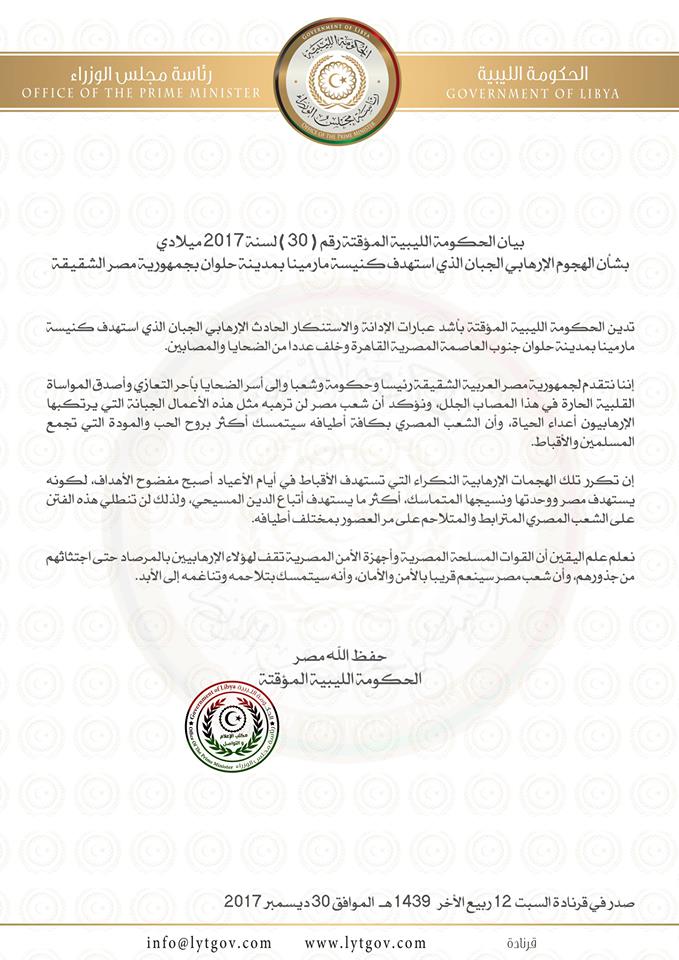 ليبيا – أدانت الحكومة المؤقتة بأشد عبارات الإدانة والإستنكار الحادث الإرهابي الجبان الذي استهدف كنيسة مارمينا بمدينة حلوان جنوب العاصمة المصرية القاهرة وخلف عدداً من الضحايا والمصابين.