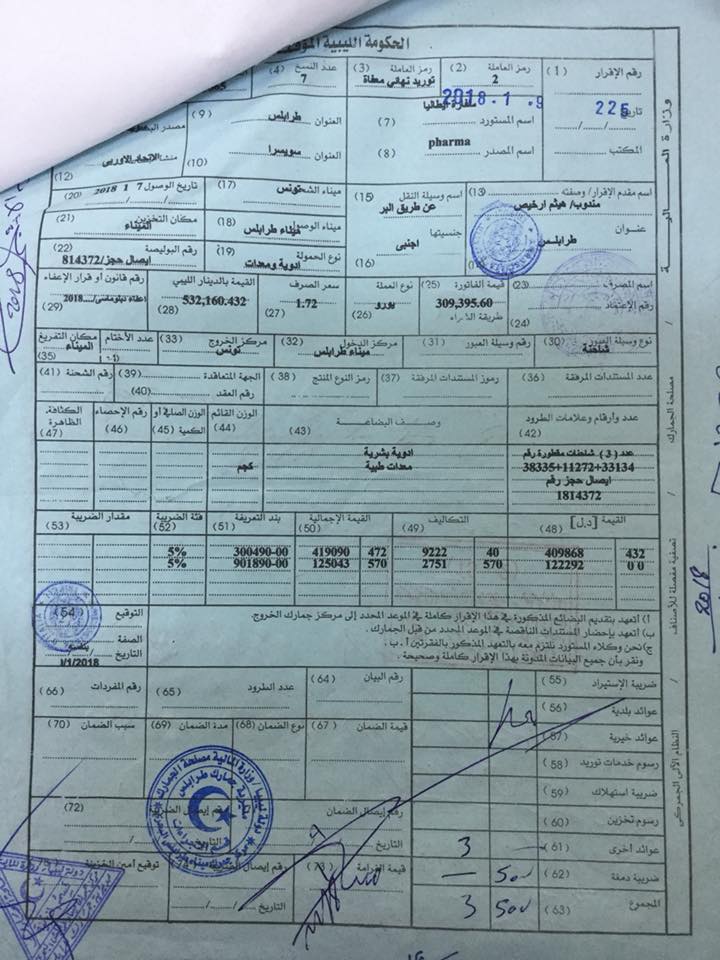 الصحيفة التي أشادت بمعمل أعضاء القسم أكدت بأن الأعضاء قد تبين لهم أثناء تفتيش ومعاينة الشحنة الموردة بموجب تالإقرار الجمركي رقم (682 / 2018) وجود 2000 علبة تحمل اسم شركة ” TEVA ” الإسرائيلية التي تحظر ليبيا التعامل معها وفق لقرار الحظر رقم 354/ 2010 م والصادر عن وزارة المالية .