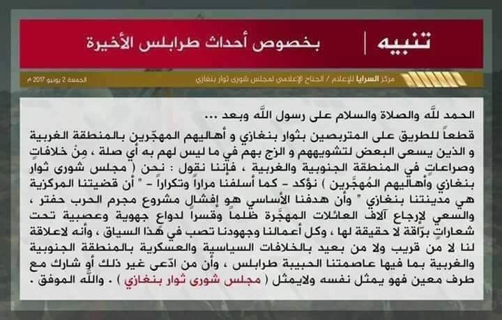 إن ذاكرة المتابع ورغم تتابع الاحداث تذكر جيداً البيان الشهير الذي صدر عن مايسمى بـ ” مجلس شورى ثوار بنغازي ” فى يونيو الماضي عقب الهجمات التي شنتها قوات السرايا جنوباً وغرباً وقد أكد المجلس فى بيانه وكشاهد من أهلها ، على أن السرايا تحاول الزج بالمهجرين فى صراعات لاطائل منها مشيراً فى بيانه لجمل من قبيل ” الصراع السياسي والشعارات البراقة ” وذلك فى إشارة منه لشعار عودة النازحين الذي رفعته السرايا وداعميها على الصعيدين المالي والسياسي والاعلامي والحزبي ، فهل هناك من يحتاج بعد هذا لدليل اضافي ليثبت من هو المتاجر بقضايا الانسان الليبي وهمومه ؟