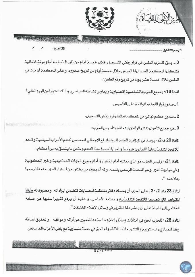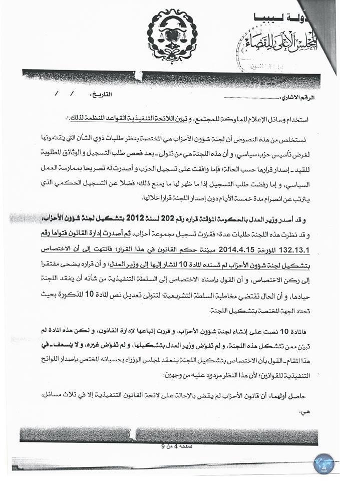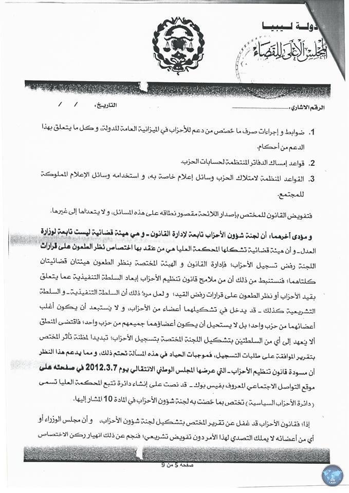 رأي وفتوى إدارة القانون المختصة باصدار الفتاوي القانونية إعتبر لجنة وزارة العدل المشكلة سنة 2012 لتشكيل الاحزاب غير ذي إختصاص معتبرة كل ما صدر عنها من قرارات لتسجيل جمعيات كأحزاب تعد قرارات منعدمة بما فى ذلك الاحزاب نفسها .