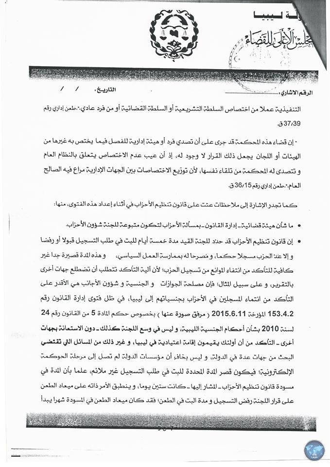 ليبيا – أصدرت الإدارة العامة للقانون بالمجلس الأعلى للهيآت القضائية في البيضاء رأياً قانونياً بسحب شرعية الأحزاب والكيانات السياسية القائمة في ليبيا منذ عام 2012 مع تحديدها للضوابط الصحيحة التي رأت ان العملية يجب أن تسير وفقاً لها.