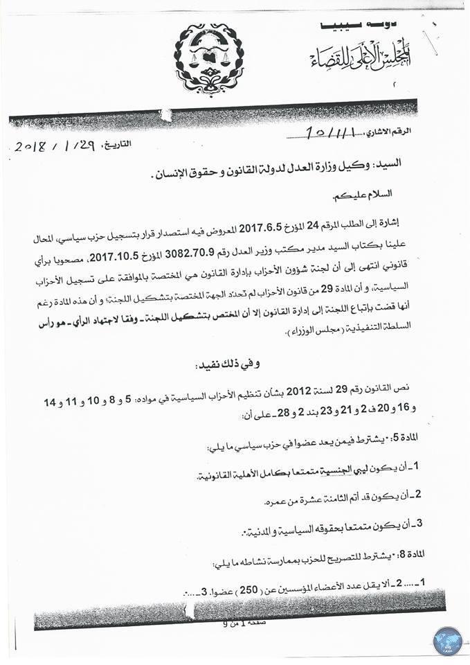 وذكرت الإدارة العامة للقانون بالمجلس الأعلى للهيآت القضائية في الرأي الصادر يوم 29 يناير الماضي ونشرته وكالة الأنباء الليبية مساء الاثنين أنها رأت ذلك عقب دراسة الأرضية القانونية للأحزاب السياسية في البلاد والطريقة التي تعمل بها .