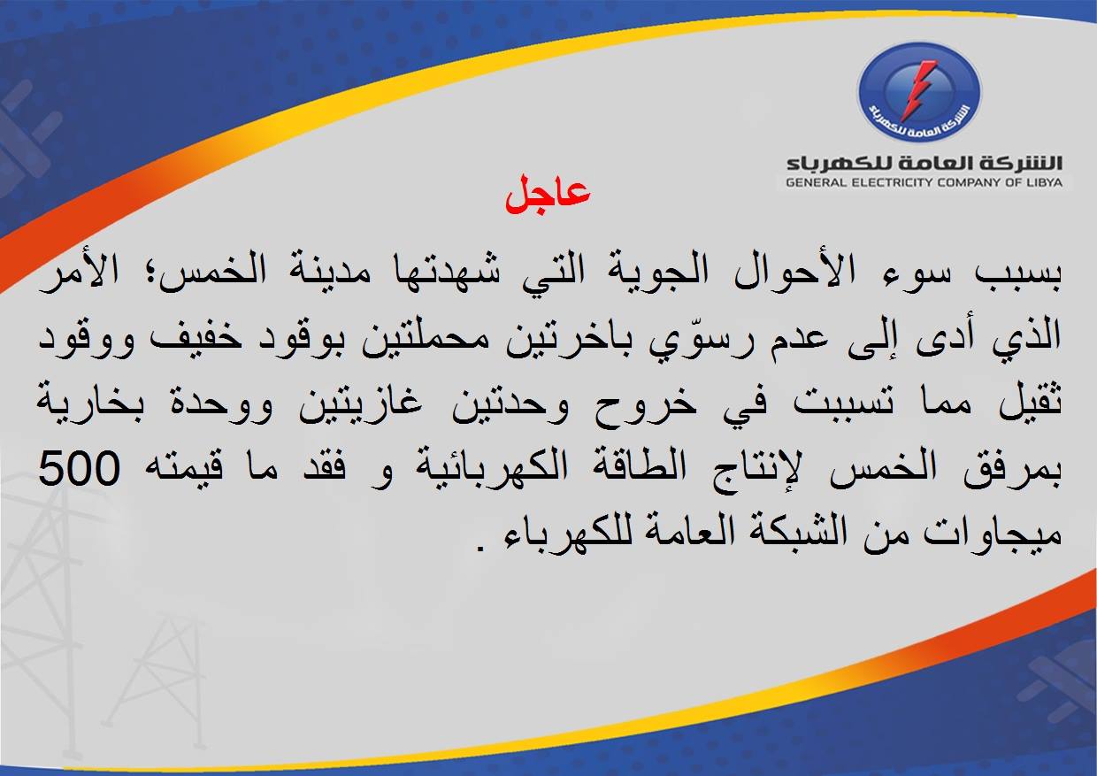 ليبيا – أعلنت الشركة العامة للكهرباء عن عدم رسو باخرتين محملتين بوقود خفيف ووقود ثقيل نتيجة سوء الاحوال الجوية التي شهدتها مدينة الخمس.