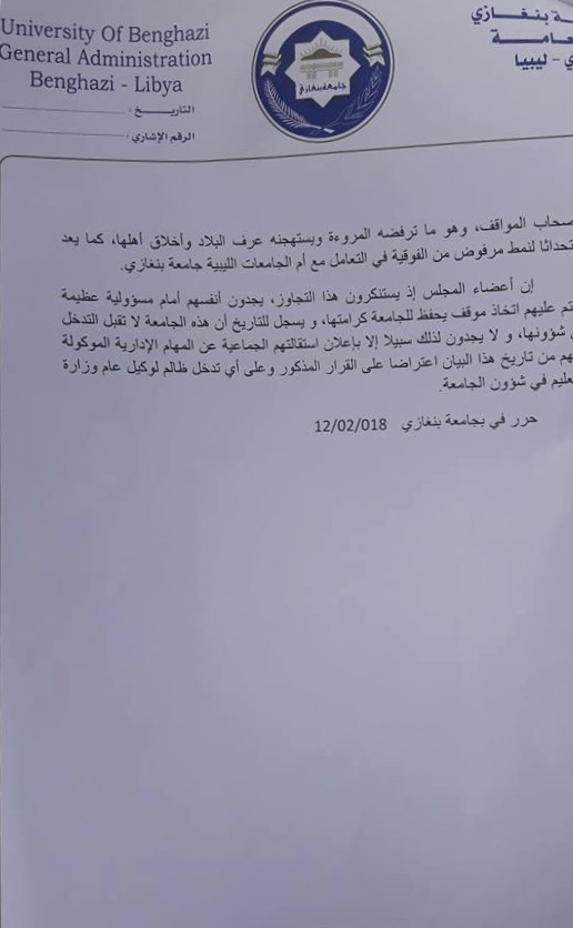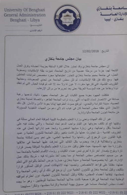 ليبيا – أعلن مجلس جامعة بنغازي في بيان له اليوم الإثنين استقالته الجماعية من الادارة العامة للجامعة وذلك إنطلاقاً من واجب المسؤولية الملقاة على عاتقه .