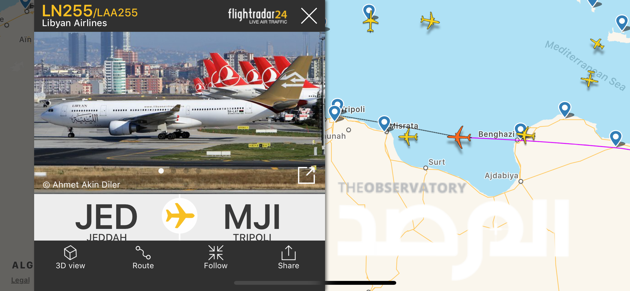 وتبين لـ المرصد بحسب تطبيق Flight Radar الذي يتابع حركة الملاحة الجوية العالمية بشكل مباشرة تحول مسار طيران رحلة الخطوط الجوية الليبية ذي الرقمLN255 على تمام الساعة 8:40 دقيقة من جدّة الى مصراتة لذات السبب .