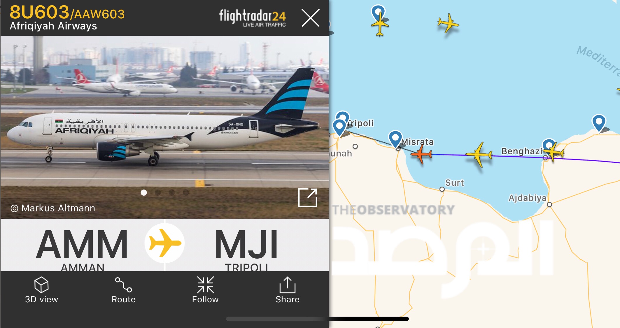 ليبيا – غيرت رحلة الخطوط الجوية الافريقية ذي الرقم 8U603 مسارها من مطار الملكة علياء فى عمّان إلى مصراتة بعد تلقيها أمراً بالهبوط فيه إثر توقف الملاحة فى مطار معيتيقة .