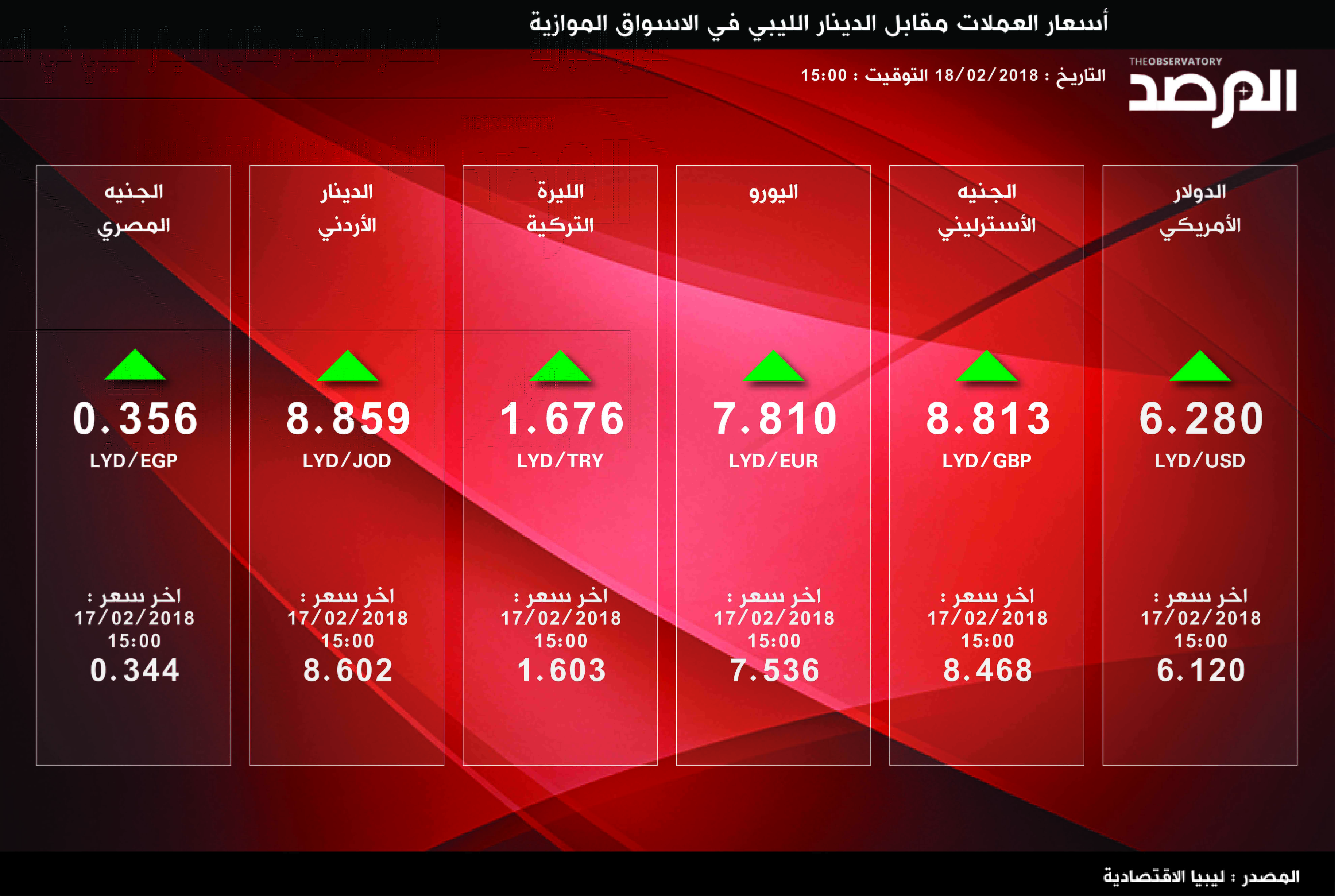 ليبيا – تابعت صحيفة المرصد أسعار العملات الاجنبية مقابل الدينار في السوق الموازية حتى الساعة الثالثة من ظهر اليوم الأحد 18 فبراير 2018  وتشمل الدولار الامريكي والجنيه الاسترليني واليورو والليرة التركية والدينار الاردني والجنيه المصري .