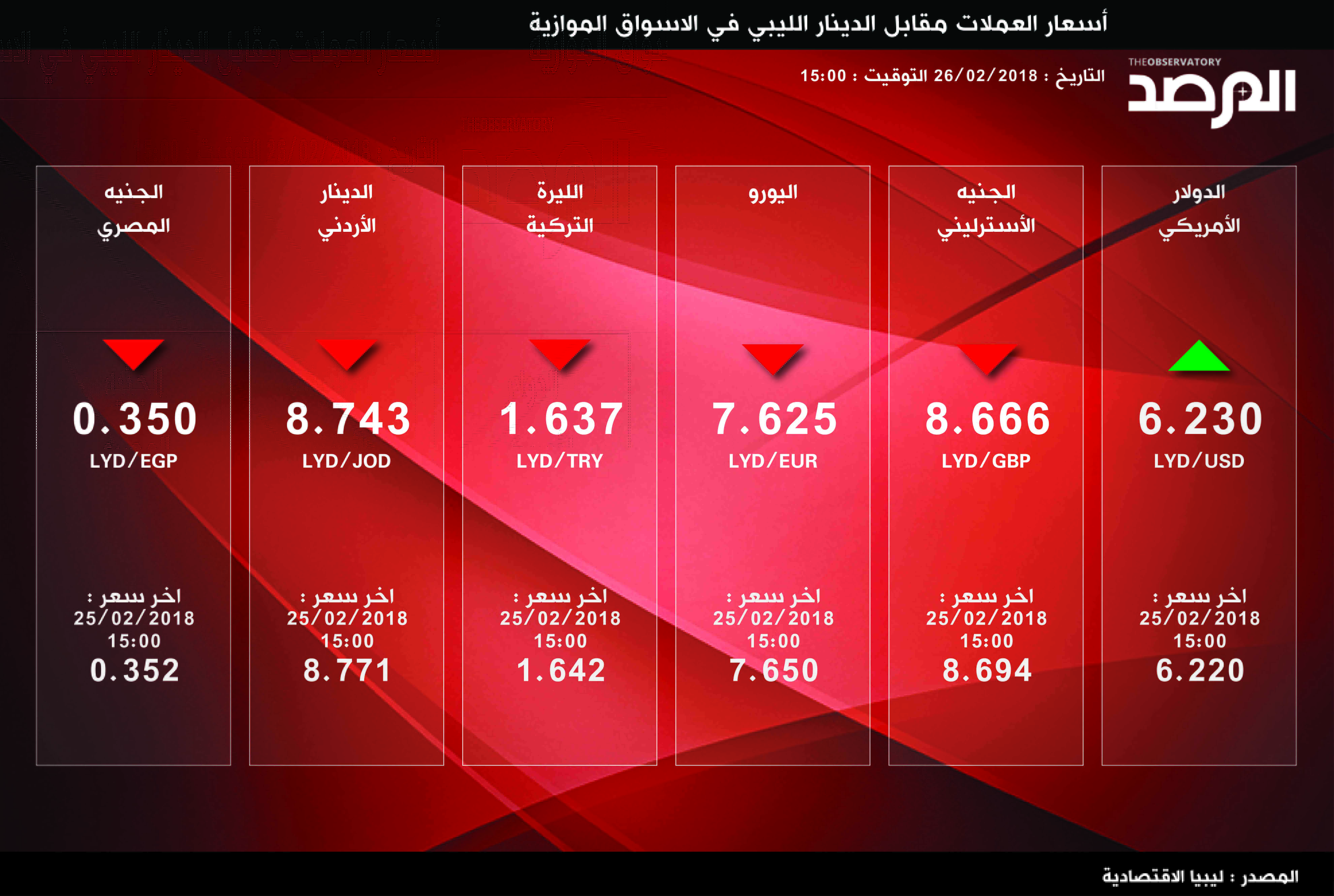 ليبيا – تابعت صحيفة المرصد أسعار العملات الاجنبية مقابل الدينار في السوق الموازية حتى الساعة الثالثة من ظهر اليوم الاثنين 26 فبراير 2018 وتشمل الدولار الامريكي والجنيه الاسترليني واليورو والليرة التركية والدينار الاردني والجنيه المصري .