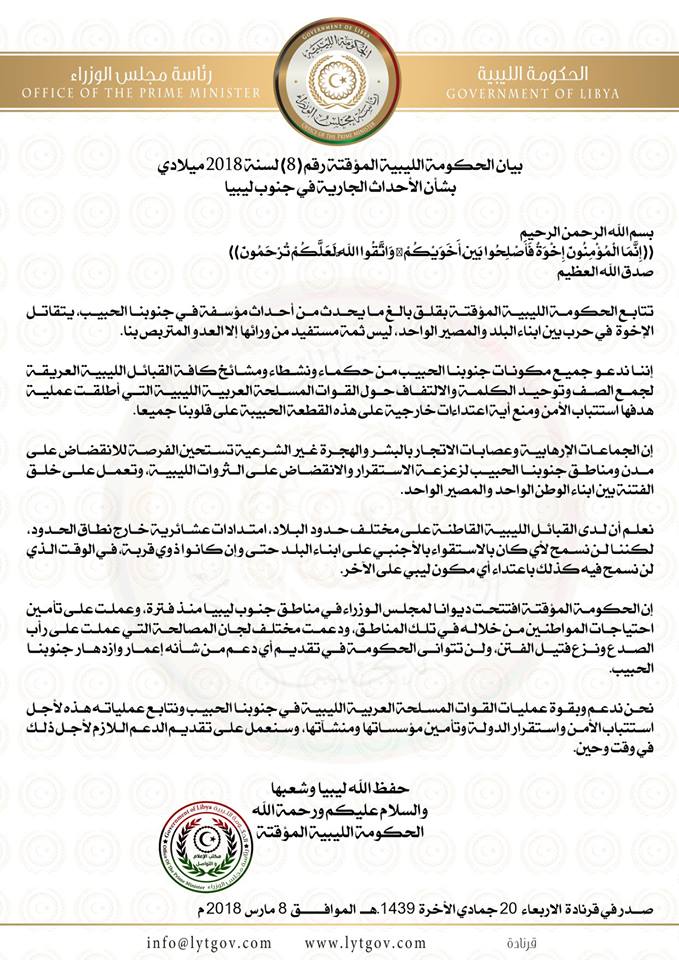 الحكومة المؤقتة دعت في بيان لها تلقت المرصد نسخة منه جميع مكونات الجنوب من حكماء ونشطاء ومشائخ كافة القبائل الليبية العريقة لجمع الصف وتوحيد الكلمة والالتفاف حول القوات المسلحة التي أطلقت عملية هدفها استتباب الأمن ومنع أية اعتداءات خارجية على الجنوب.