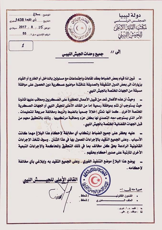 يشار الى أن رئيس المجلس الرئاسي فائز السراج قد أمر بصفته “القائد الاعلى للقوات المسلحة” في بلاغ له يوم 15 أغسطس 2017 بمعاقبة ضباط غرفة عمليات مصراتة – سرت (البنيان المرصوص) بعد زيارتهم الى دولة قطر ولقائهم بأميرها تميم بن حمد دون الحصول على موافقة الجهات المختصة.
