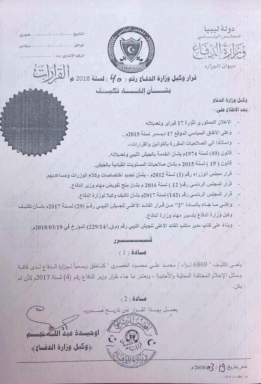 القرار الذي تلقت المرصد نسخة منه نص على الغاء تكليف اللواء محمد الغصري كناطق رسمي باسم وزارة دفاع الوفاق لدى كافة وسائل الاعلام المختلفة المحلية والدولية ، معتبراً أن ما جاء بقرار وزير الدفاع رقم 4 لسنة 2017 كأنه لم يكن.