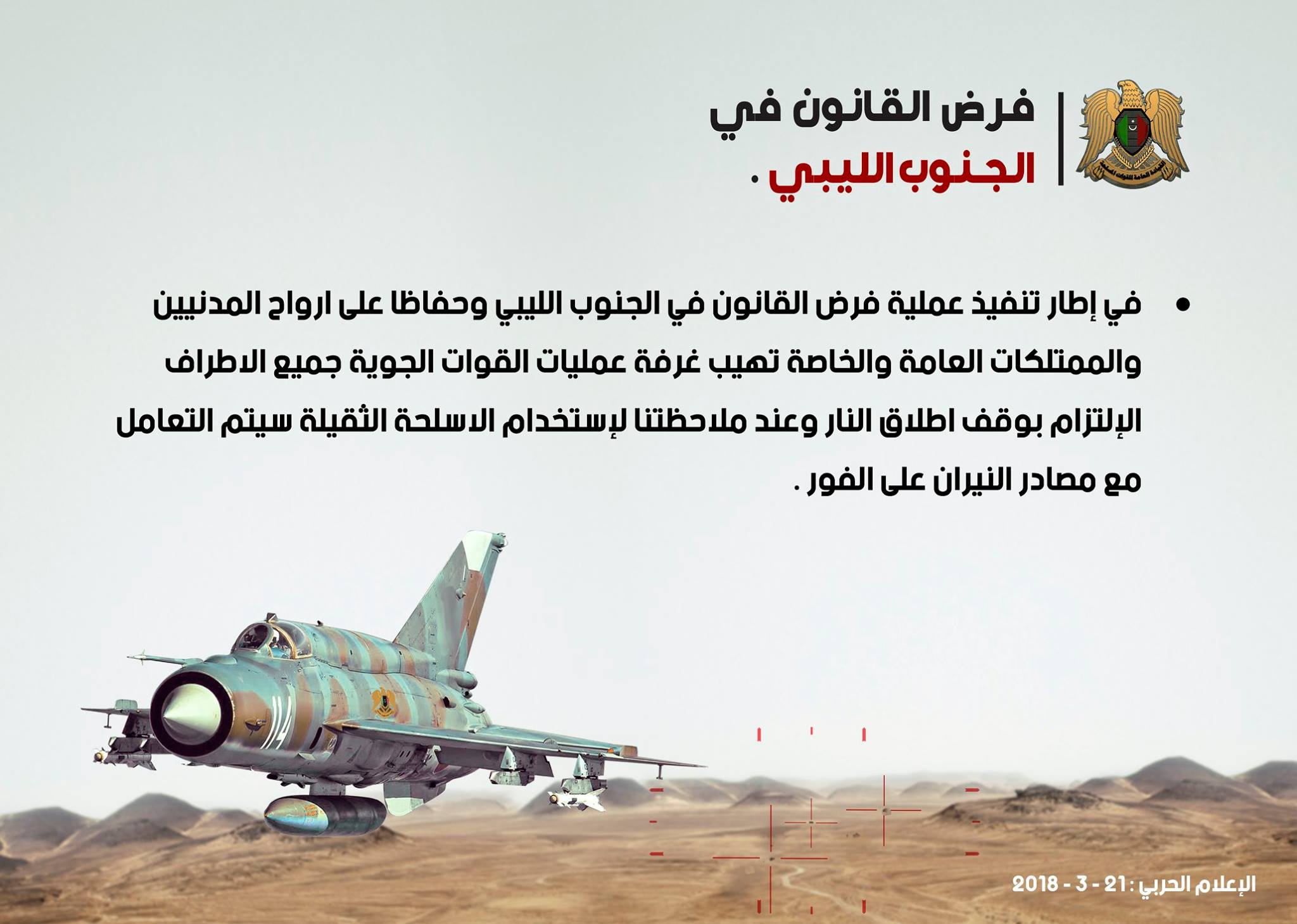 غرفة العمليات الجوية حذرت بحسب المكتب الاعلامي للقيادة العامة بأنه عند ملاحظتها استخدام الاسلحة الثقيلة سيتم التعامل مع مصادر النيران على الفور .