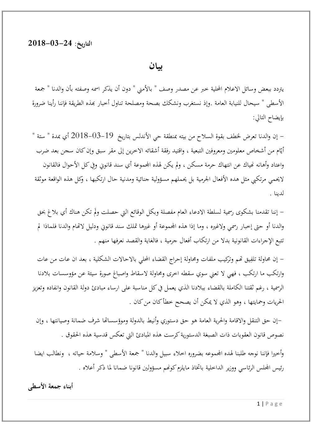 وأكد البيان على ثقة عائلة الاسطى الكاملة في القضاء الليبي الذي يعمل في كل مناسبة على ارساء مبادئ دولة القانون وانفاد القانون وتعزيز الحريات وحمايتها وهو الذي لا يمكن أن يصحح خطأ كائن من كان .
