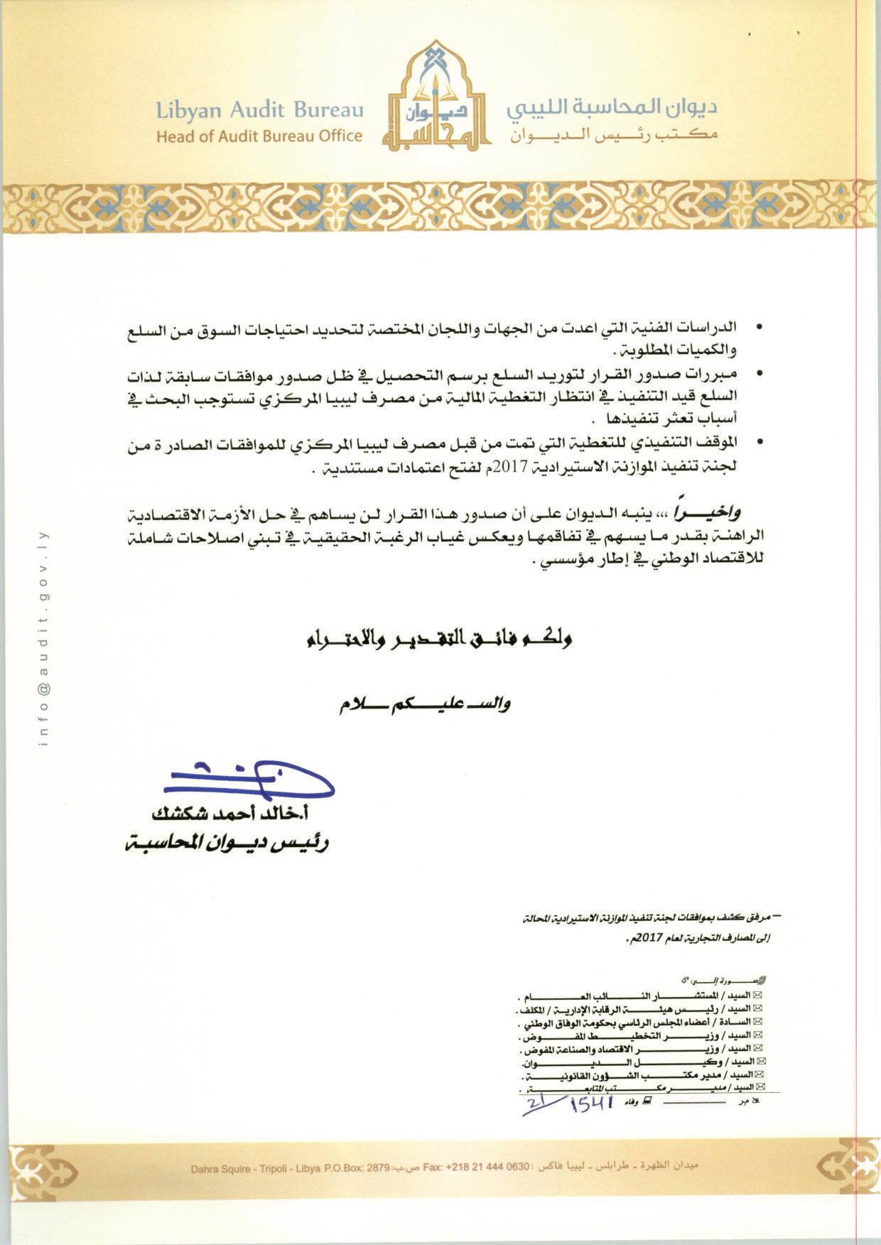 وطالب الديوان أيضا بموافاته بالموقف التنفيذي للتغطية التي تمت من قبل مصرف ليبيا المركزي للموافقات الصادرة من لجنة تنفيذ الموازنة الإستيرادية للعام 2017 لفتح إعتمادات مستندية مختتما مخاطبته بالتنبيه على أن صدور هذا القرار لن يساهم في في حل الأزمة الإقتصادية الراهنة بقدر ما يسهم في تفاقمها ويعكس غياب الرغبة الحقيقية في تبني إصلاحات شاملة للإقتصاد الوطني في إطار مؤسسي.