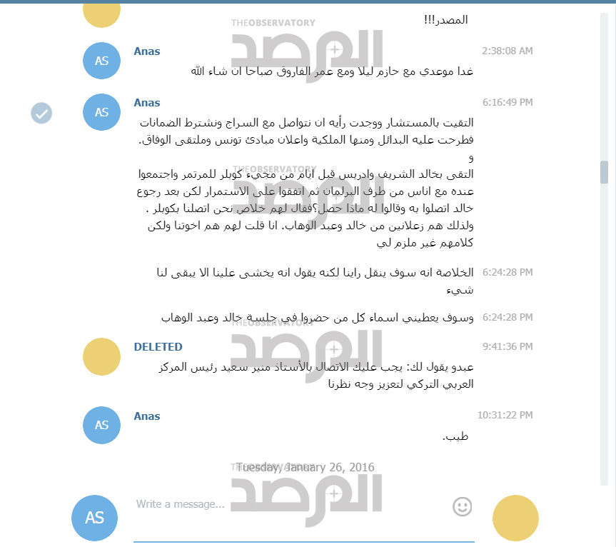 فى التسجيل الاول وهو مراسلات بين الحرابي والساعدي يظهر مدى مكانة الأخير لديهم كمرجعية دينية وكذلك وجود تنسيق رفيع بين الطرفين ، ولكنها تبين أيضاً حجم الصراعات على النفوذ والقيادة بين المجموعات الإرهابية فى بنغازي بما فى ذلك تنظيم داعش الذي يؤكد الحرابي قتالهم إلى جانبه جنباً إلى جنب قبل أن تظهر بعض الخلافات بينهم فيما إنحاز وسام بن حميد وجلال مخزوم وانصار الشريعة للتنظيم بشكل كامل .
