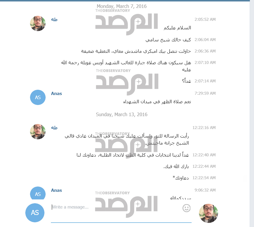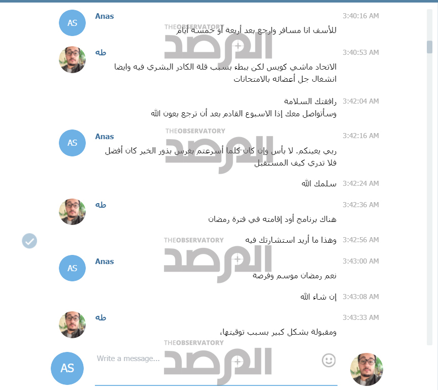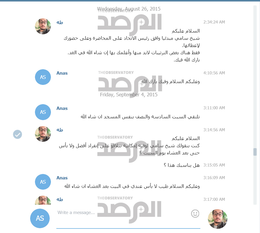 يؤكد حريب للساعدي فى إحدى المراسلات فى شهر مارس من سنة 2016 بأن رئيس الإتحاد وافق على أن يعطي الأخير محاضرة فى الجامعة ويضيف له فى أخرى بأنه يستعد لإقامة برنامج فيها بالتزامن مع شهر رمضان وقد لقي هذا الأمر استحسان الساعدي ، ولا يقف الأمر عند هذا الحد بل يصل إلى تبادل الزيارات واللقاءات فى أحد المساجد وفيه محادثة بينهما يسأل حريب الساعدي عن موضوع يتعلق بتبديل إمام وخطيب أحد مساجد منطقة حي الاندلس !