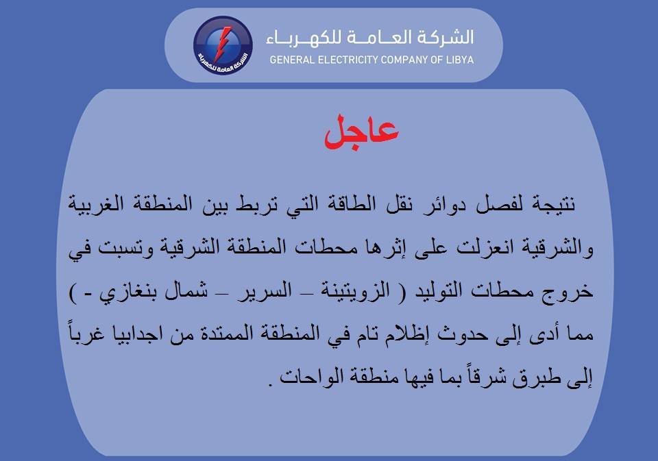 ليبيا – أعلنت الشركة العامة للكهرباء عن حدوث اطفاء تام مساء اليوم الخميس في المنطقة الممتدة من مدينة اجدابيا غرباً الى مدينة طبرق شرقاً بما فيها منطقة الواحات.