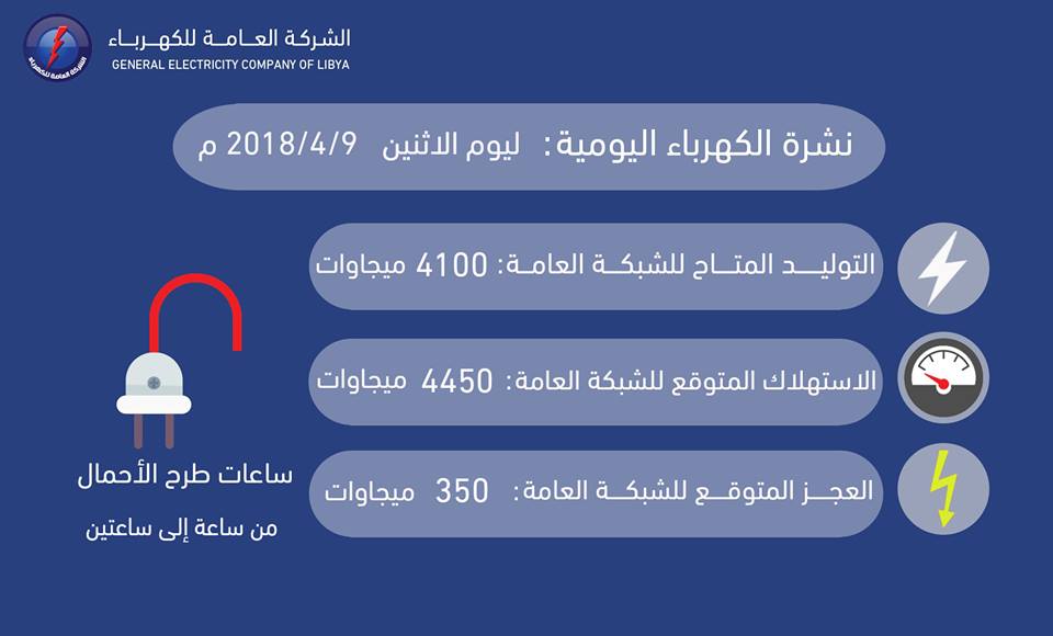ليبيا – أعلنت الشركة العامة للكهرباء في نشرتها اليومية أن ساعات طرح الأحمال المتوقعة اليوم الإثنين 9 أبريل 2018 سيكون بين ساعة إلى ساعتين.