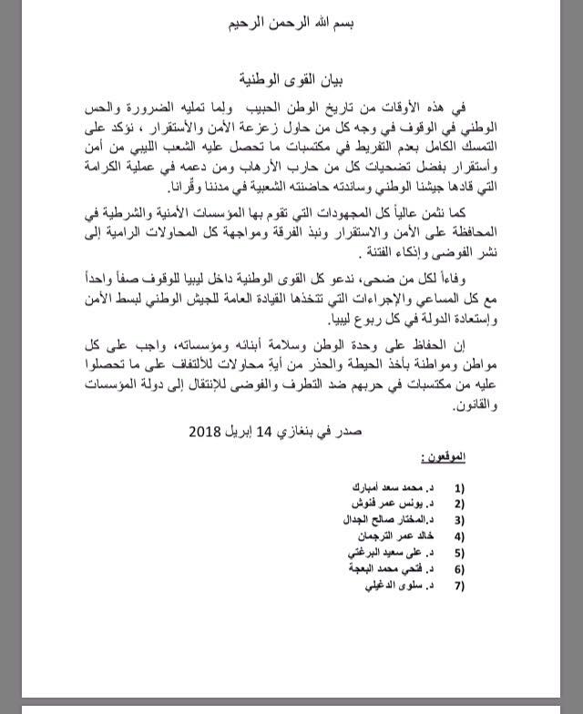 واعتبر البيان الذي صدر في مدينة بنغازي إن الحفاظ على وحدة الوطن وسلامة أبنائه ومؤسساته واجب على كل مواطن ومواطنة بأخذ الحيطة والحذر من أية محاولات للالتفاف على ما تحصلوا عليه من مكتسبات في حربهم ضد التطرف والفوضى للإنتقال إلى دولة المؤسسات والقانون.