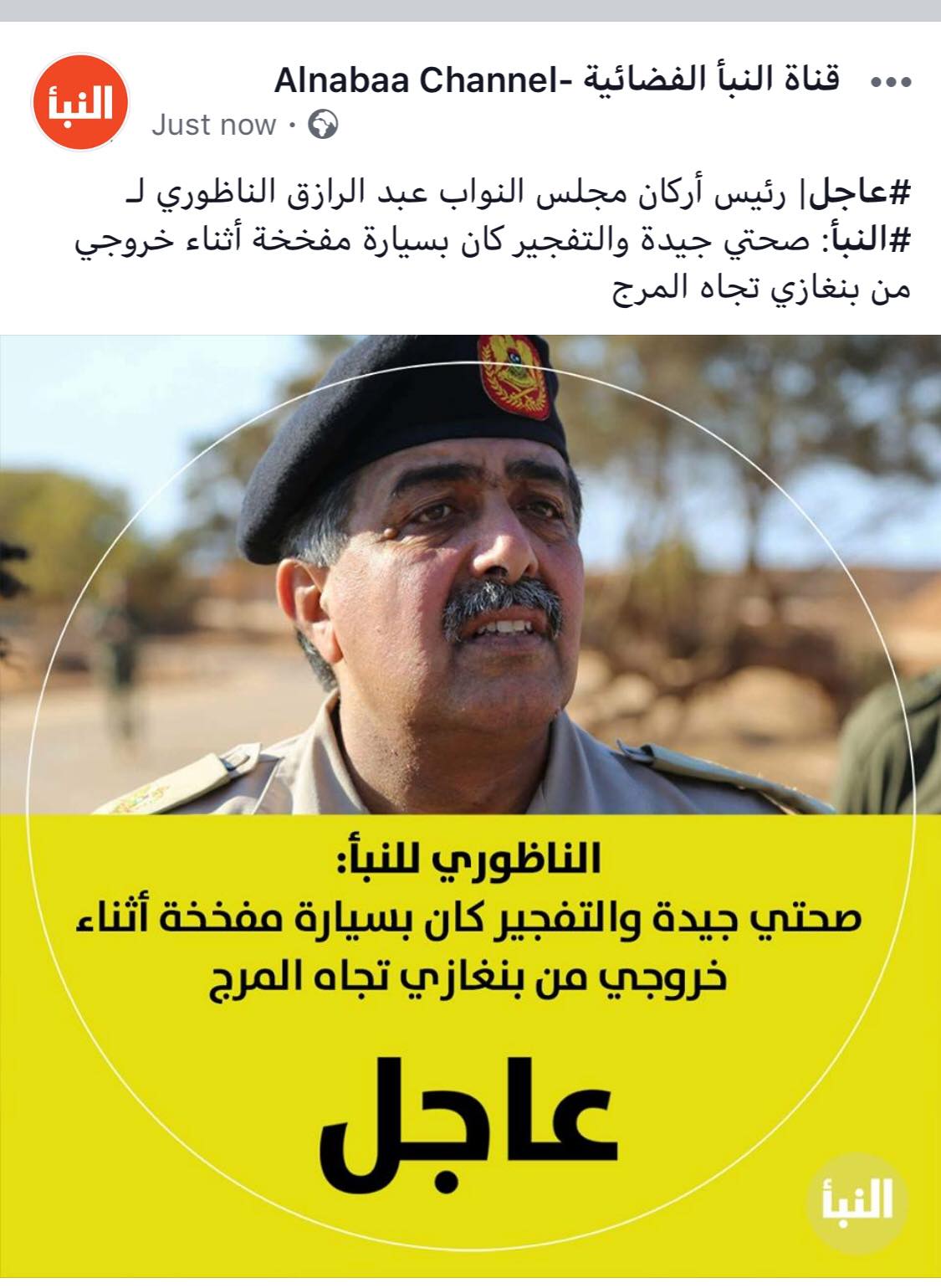 يشار إلى أن قناة “النبأ” نسبت عدد من التصريحات للناظوري على لسانه تضمن “أنه في صحة جيدة والتفجير كان بسيارة مفخخة أثناء خروجي من بنغازي تجاه المرج”.. “أنفي عقدي اجتماعات لتكليفي خلفاً لحفتر وهو في البلاد وبصحة جيدة “، مبينةً بأن الناظوري قد أفادها بهذه المعلومات بشكل مباشر.