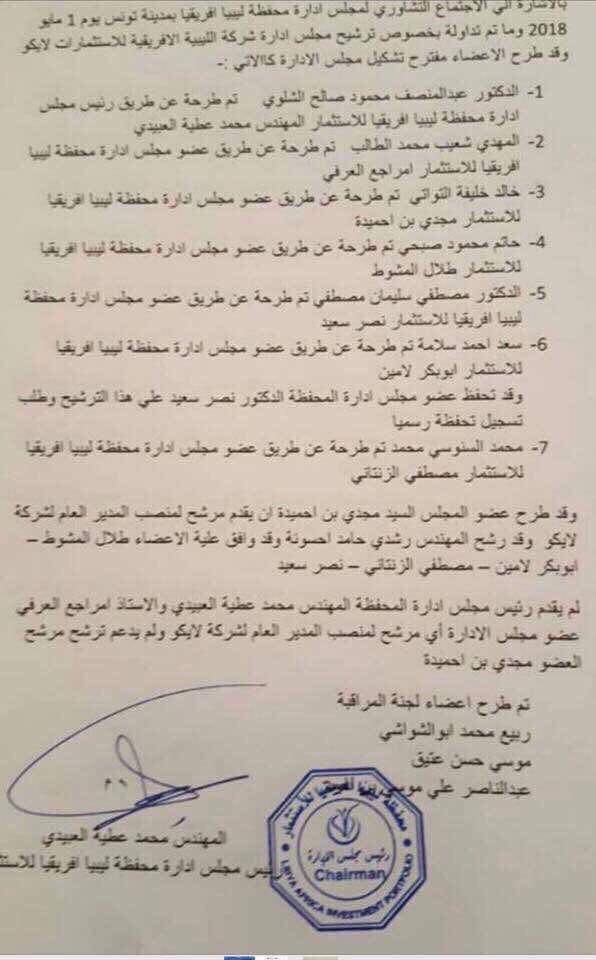 وأشار المحضر إلى طرح إسم محمد السنوسي محمد عن طريق عضو مجلس إدارة المحفظة مصطفى الزنتاني ليطرح العضو مجدي بن حميد أن يقدم مرشحا لمنصب المدير العام لشركة “لايكو” وهو رشدي حامد حسونة ليوافق عليه الأعضاء طلال المشوط وأبو بكر أمين ومصطفى الزنتاني ونصر سعيد في وقت لم يقدم فيه رئيس مجلس إدارة المحفظة والعضو مراجع العرفي أي مرشح لمنصب المدير العام ولم يدعم العرفي كجدي بن حميدة.