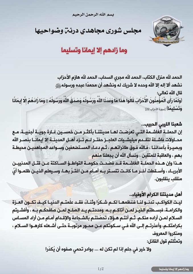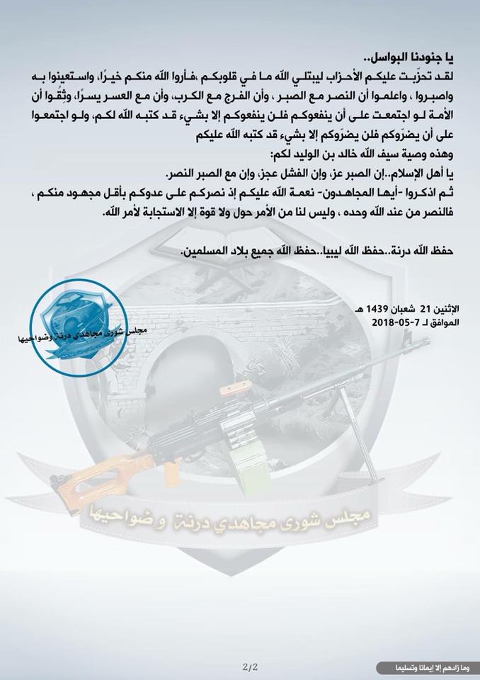 ووجه البيان رسالة الى مقاتلي شورة المجاهدين :” لقد تجزبت عليكم عليكم الاحزاب ليبتلي الله ما في قلوبكم فأروا الله منكم خيراً واستعينوا به واصبروا واعلموا أن النصر مع الصبر”.