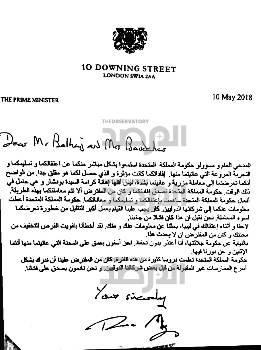وقالت رئيسة الوزراء تيريزا ماي في الرسالة الموجهة إلى بلحاج وزوجته فاطمة إن “أفعال حكومة المملكة المتحدة ساهمت في اعتقالكما وتسليمكما ومعاناتكما. نيابة عن حكومة صاحبة الجلالة، أعتذر منكما بلا تحفظ”.