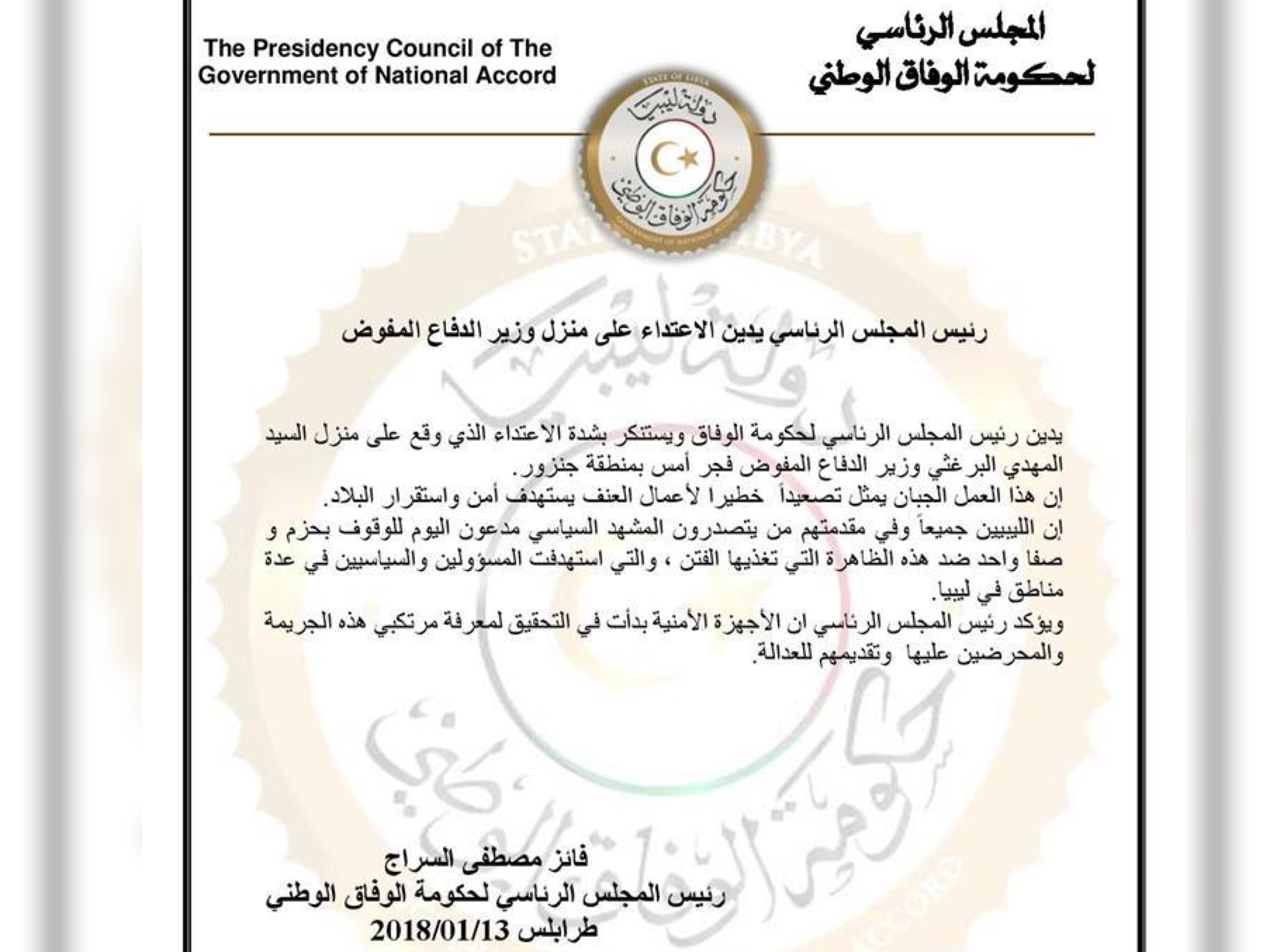 ليأتي الرد سريعاً من مكتب السراج يوم 3 يناير 2018 على شكل برقية معممة على السفارات والبعثات والقنصليات فى الخارج تؤكد بأن البرغثي لازال موقوفاً عن العمل بقرار من ” القائد الاعلى – رئيس الرئاسي ” وان على هذه الجهات عدم الاعتداد بكل مايصدر عنه !