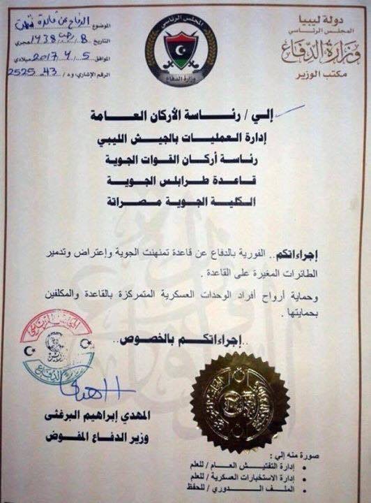 وعلى إثره أعلن العقيد محمد قنونو المتحدث باسم غرفة عمليات طوارئ سلاح الجو المرابضة بقاعدة مصراتة الجوية التابعة لدفاع الوفاق يوم 6 ابريل 2017 شن سلسلة غارات جوية على قاعدة براك وذلك بهدف تحييدها عن الخدمة .