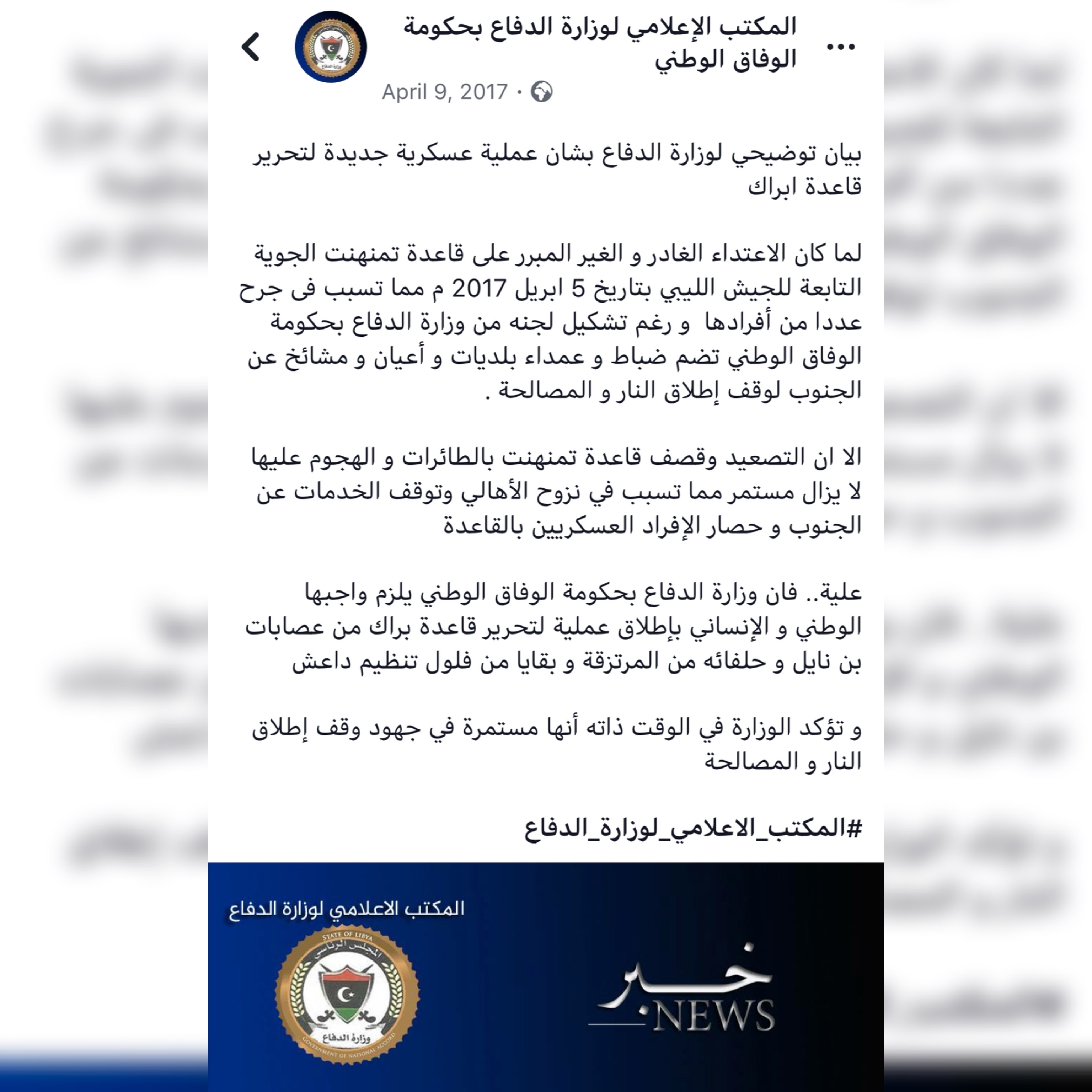 فى 9 أبريل من ذات العام أصدرت وزارة دفاع الوفاق بياناً عبر صفحتها على فيسبوك أعلنت فيه رسمياً إنطلاق عملية عسكرية قالت إنها تهدف لتحرير قاعدة براك الشاطئ الجوية مما وصفتها بعصابات بن نائل والمرتزقة بل ذهبت الى أبعد من ذلك بادعاء وجود فلول من داعش بين صفوف الجيش داخل القاعدة .