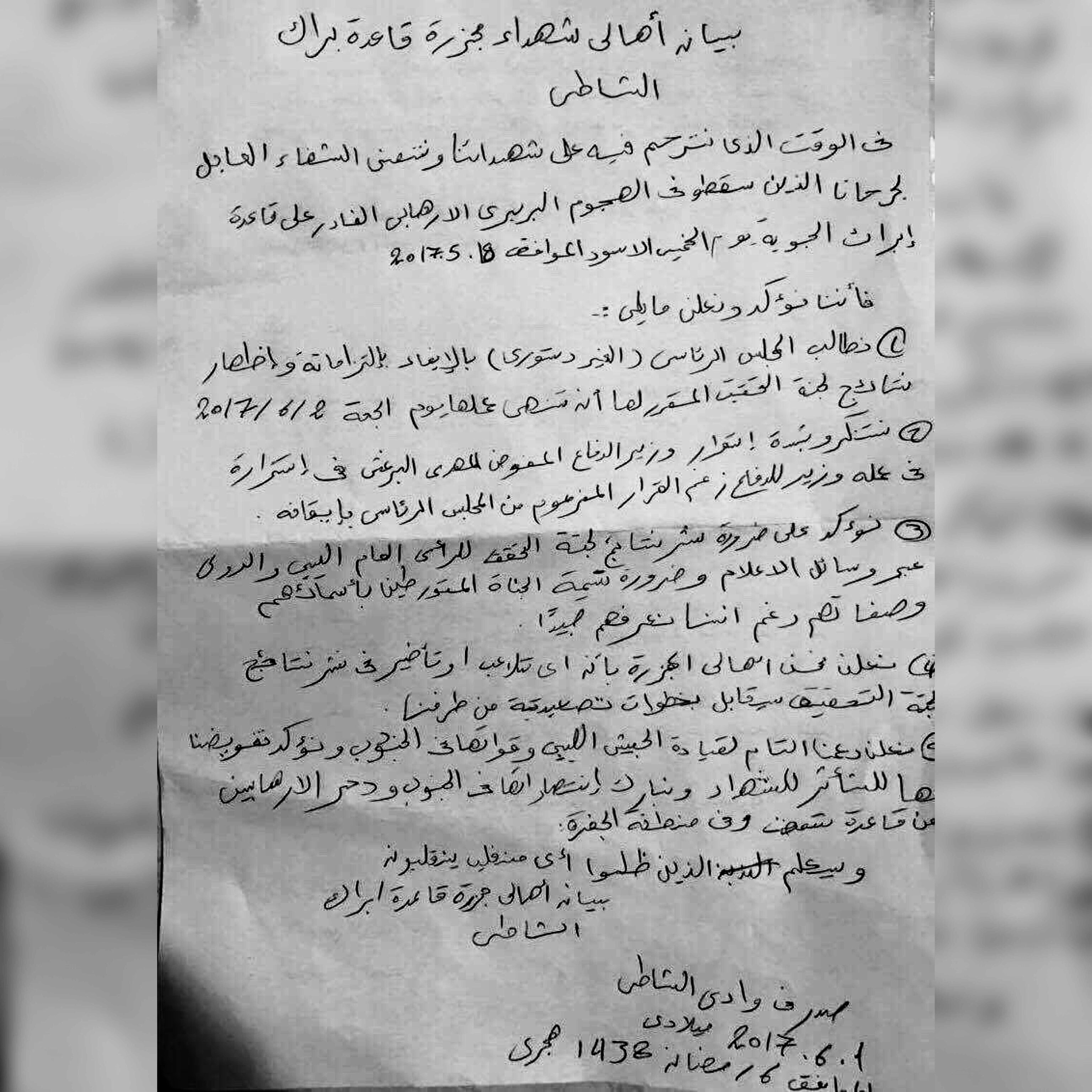 ليبيا- تحل اليوم الجمعة الذكرى السنوية الأولى لمجزرة قاعدة براك الشاطئ الجوية جنوبي البلاد ، إحدى أكثر الجرائم بشاعة فى ليبيا منذ سنوات طويلة دون تحقيق العدالة لآلاف المتضررين من عائلات ذوي الضحايا ولا حتى إعلان أي نتيجة للتحقيق سواء على المستوى الحكومي او العدلي ممثلاً فى مكتب النائب العام .
