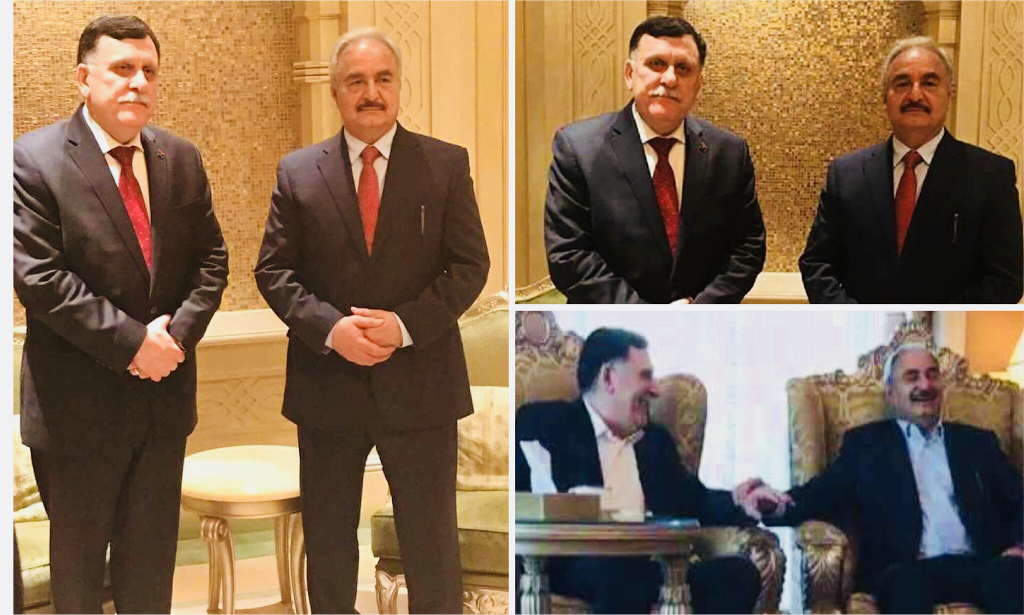 وفى 2 مايو صعد من إمارة أبوظبي ما اعتبره بعض المراقبين دخاناً أبيض يشي ربما بقرب انفراج الأزمة السياسية والعسكرية عندما عُقد اللقاء فعليا بين حفتر والسراج فى فندق قصر الإمارات برعاية الشيخ محمد بن زايد آل نهيان تلاه لقاء ودي وشخصي آخر فى اليوم التالي وكان أبرز ما تقرر فى ذلك اللقاء هو التهدئة ووقف إطلاق النار فى الجنوب .