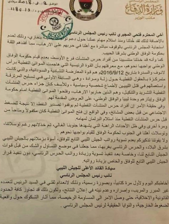 كما تحدث الوزير الموقوف فى كتابه عن خذلانه من قبل الحكومة قبل ان يغادر بنغازي الى طرابلس وعن خذلانها ايضاً لقوات ابراهيم جضران أيضاً حتى خسرت مواقعها فى الهلال النفطي لصالح من وصفهم بالمرتزقة التشاديين والسودانيين وذلك فى اشارة منه لقوات الجيش التي سيطرت على المنطقة وأعادت ضخ وتصدير النفط وارجعته لما يقارب معدلاته الطبيعية فى الوقت الذي إستمر فيه جضران فى اقفاله وابتزاز الحكومة بمبالغ تعادل عشرات الملايين يزعم بأنه ديون مستحقة لجهازه .