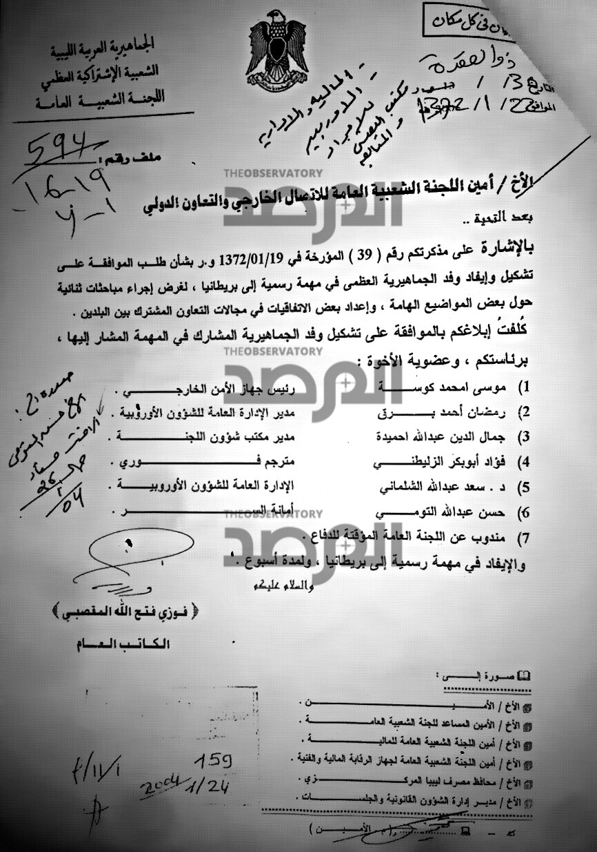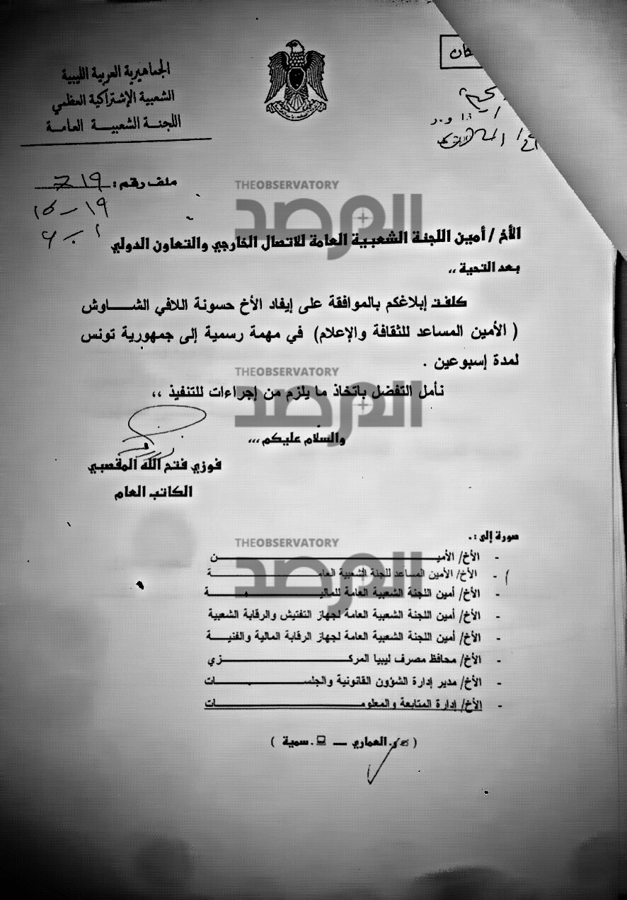وبالنسبة لهذا المستند فيمكن من خلاله تصور وفهم مدى الالتزام بتنفيذ الاجراءات المالية والادارية بين ادارات وزارة الخارجية فى السابق ، حيث يتطلب سفر الوزير فى مهمة رسمية الى تونس موافقة رئيس الحكومة والتوقيع على ايصال مالي نظير العهدة المالية ومخاطبة السفارة لتسكينه ويتضح هذا من حجم التواقيع ( التهميشات ) على هذا المستند مثلاً .