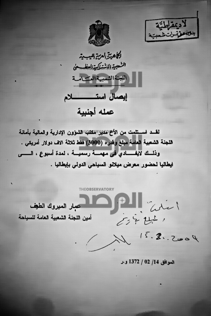 وعند البحث الذي اجرته المرصد فى بقية المستندات الخاصة بالوزير الجهيمي ، كانت المصادفة ممثلة فى هذا المستند الذي يحمل توقيعه ويعود تاريخه لسنة 2005 وهو عبارة عن إيصال استلام نقدي وقع عليه مقابل الحصول على علاوة مالية بقيمة 3000 دولار للتوجه فى مهمة عمل الى الولايات المتحدة أيضاً التي سافر لها فى عهد حكومة الوفاق بتذكرة تبلغ قيمتها 83 الف دينار !